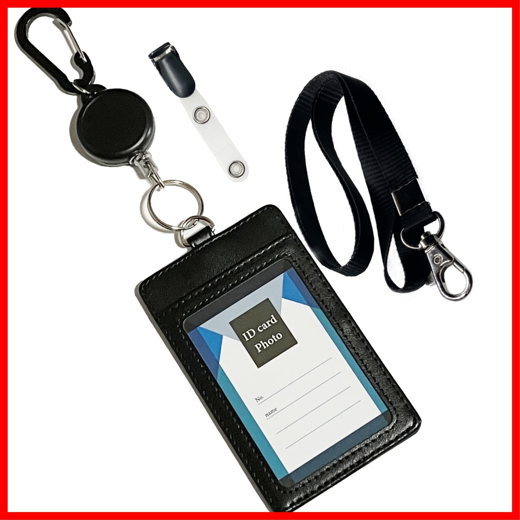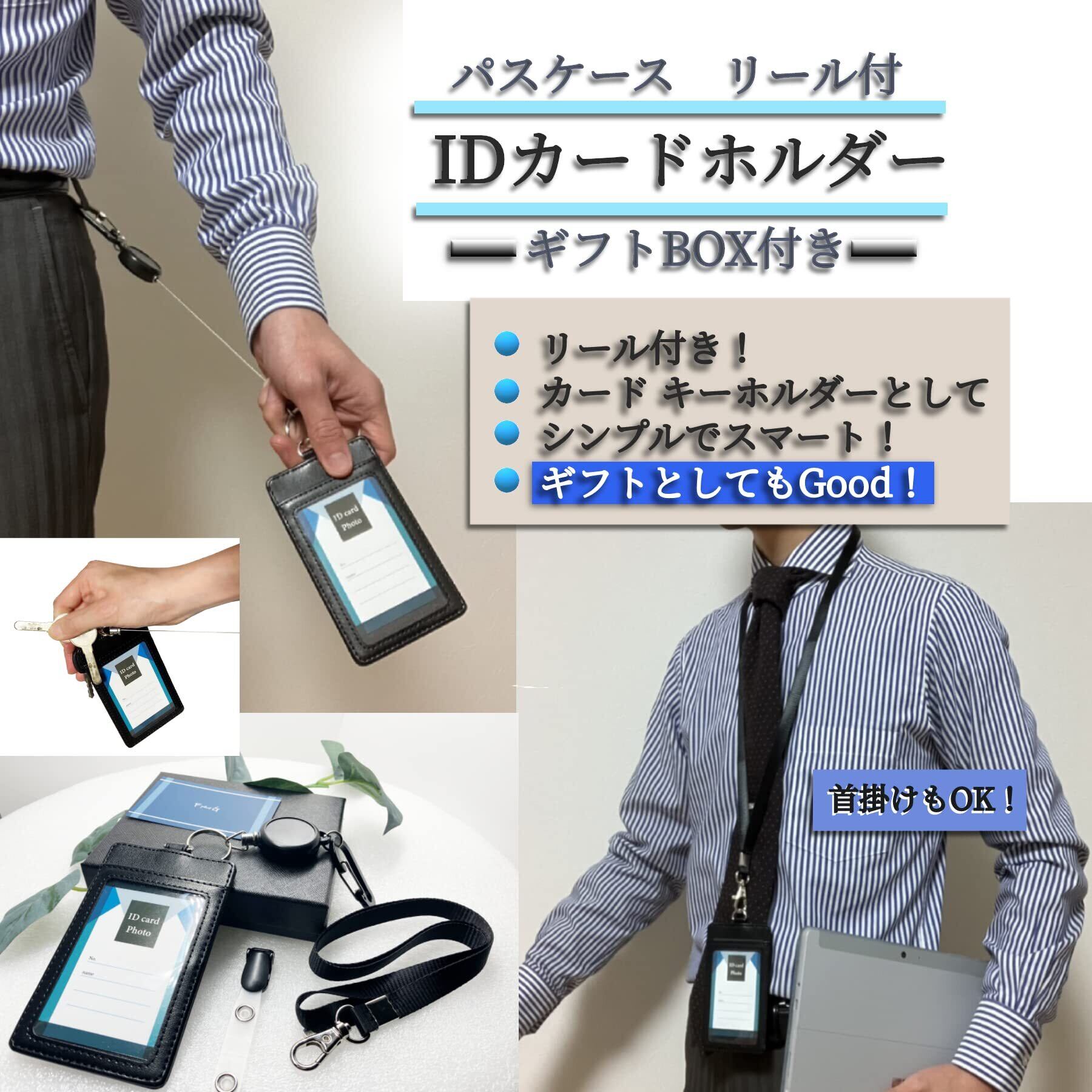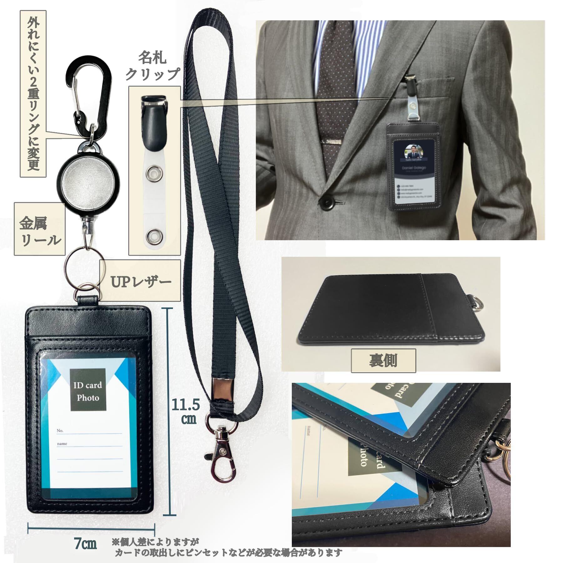【使用と特徴】JIS規格で定められているカードサイズ 5.4cm×8.6cmのクレジットカード、交通系ICカード(ICOCA・PASMOなど)、社員証、免許証などが入ります。一般的な名刺サイズ 55×91mmも入ります。金属リールは伸縮が約55㎝ほどあり長めなのでセキュリティーゲートは かがまずに楽にタッチできます。IDカードを使っての入退室管理システムなどにお使いいただけます。中に入っている台紙1枚は顔写真を貼ったり、ナンバー、名前、その他の情報などを直接記入する事ができます。