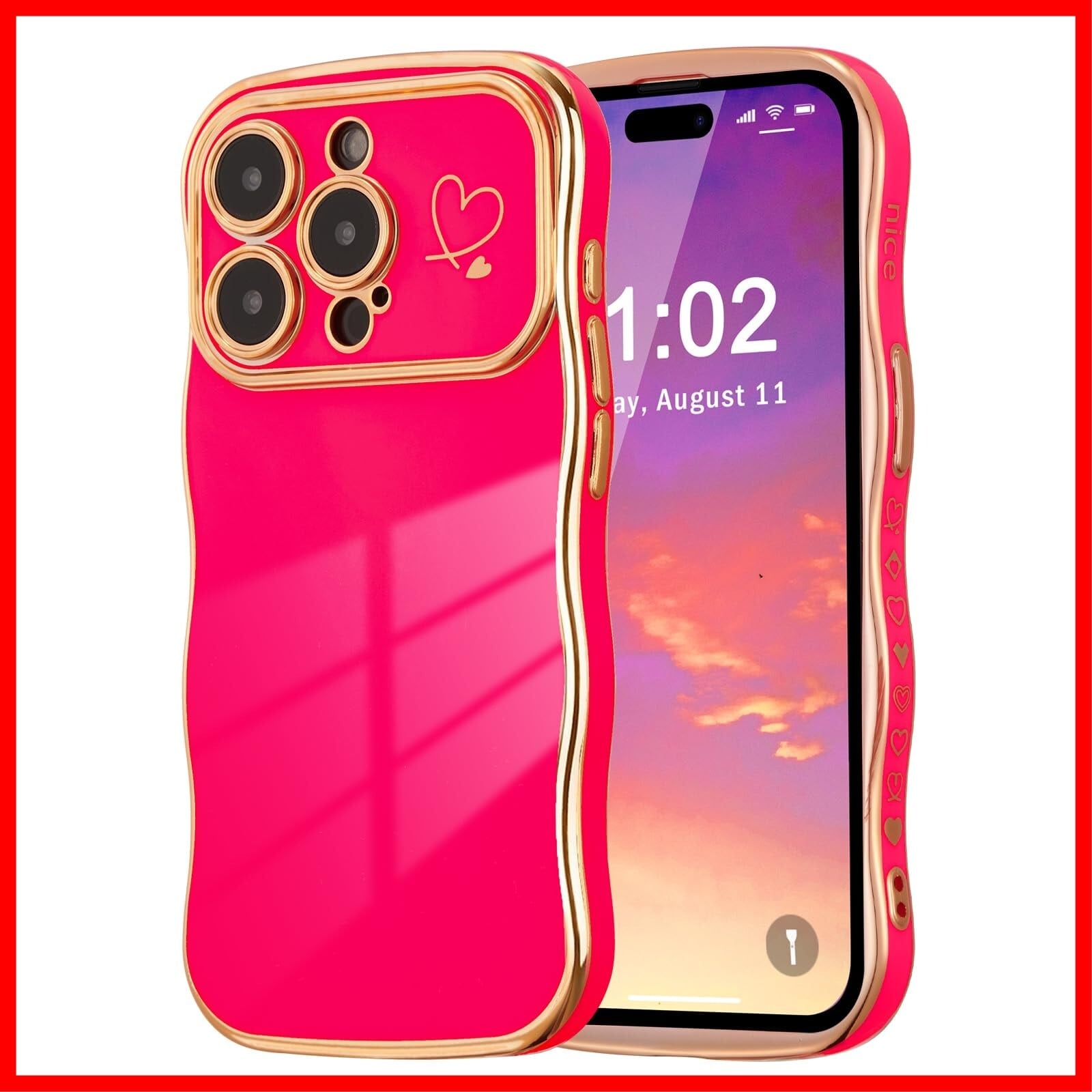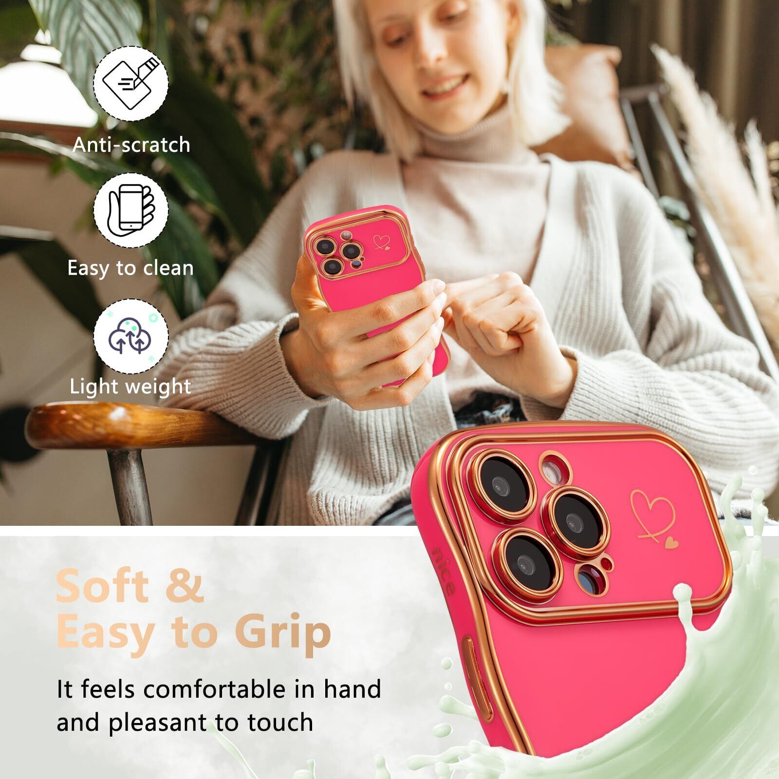 iPhone 15 Pro Max に対応、購入前に機種をご確認ください。柔らかく柔軟なtpu素材を使用し、エッジとカメラエッジの周りにメッキ技術を使用しています。カーリーウェーブフレームがエレガントさと快適なグリップ感をプラスし、ラブハートパターンがチャーミングな魅力をさらに引き立てます。縁取りのメッキ加工が、このスマホケースにトレンディでファッショナブルな印象を与え、誰の目にも留まることでしょう。