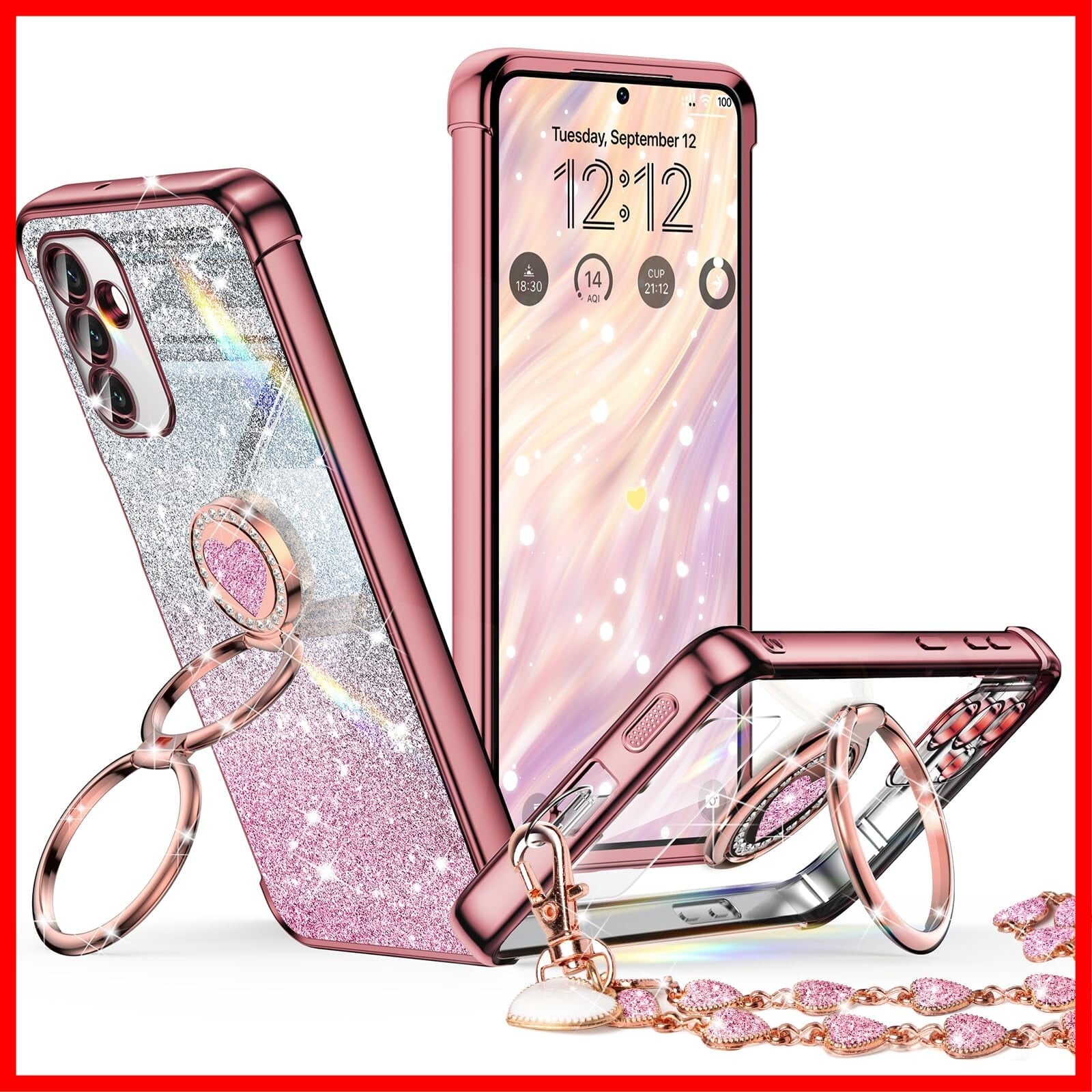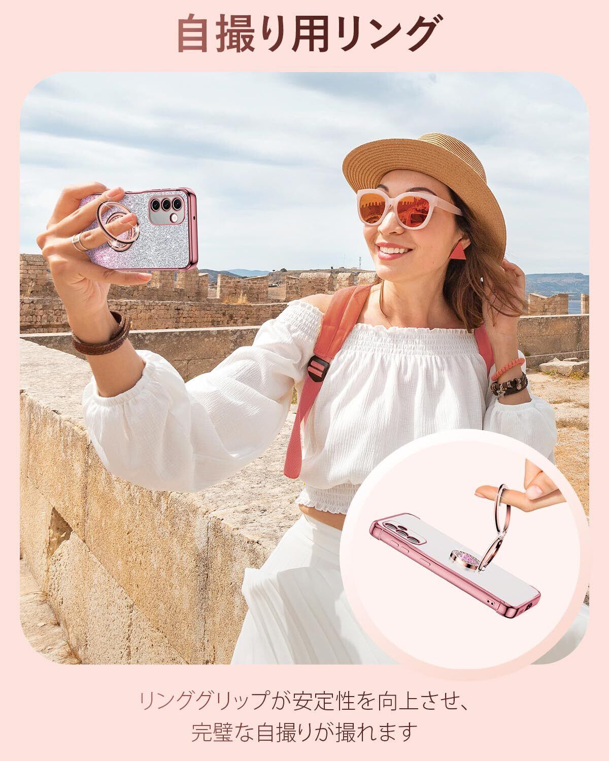 Rockaway Galaxy S24 用 ケース ダブルリング付き リストバンド ブレスレット付き ストラップ 耐衝撃 薄型 軽量 紐付き キラキラ ラブハート かわいい 女の子 おしゃれ 豪華 スマホケース ギャラクシー S24 カバー - ローズゴールド | hananoki