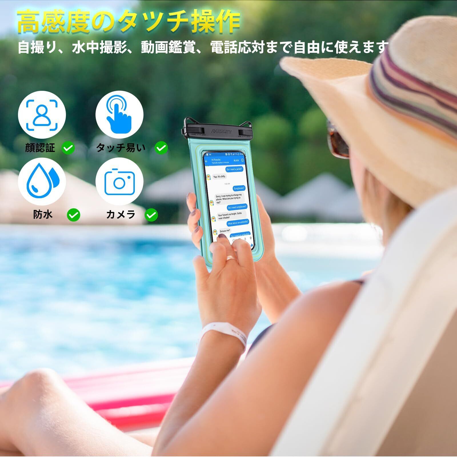 「水中撮影・顔認証」このスマホ防水ケースはお風呂やスキーにも自由に対応できます。スマホポーチの表面は高透光で、光の透過率は99.99%を超え、顔認証も一瞬で完了。また、防滴デザインのため水滴が残ったり,曇ったりはしません。いつでもクリアな画面、気楽に水中撮影ができます。また、タッチ操作や電話応対などの操作もスームズにできます。
