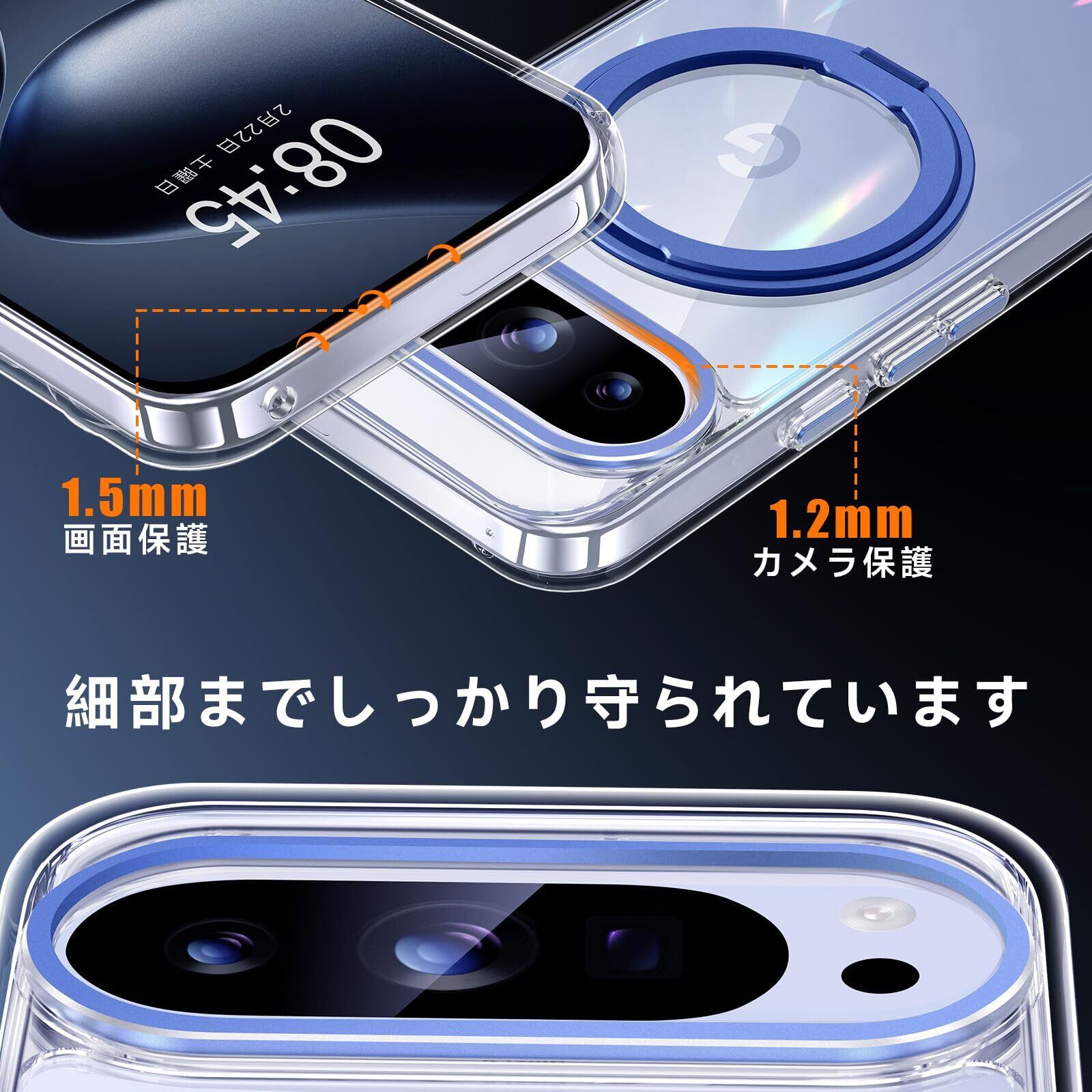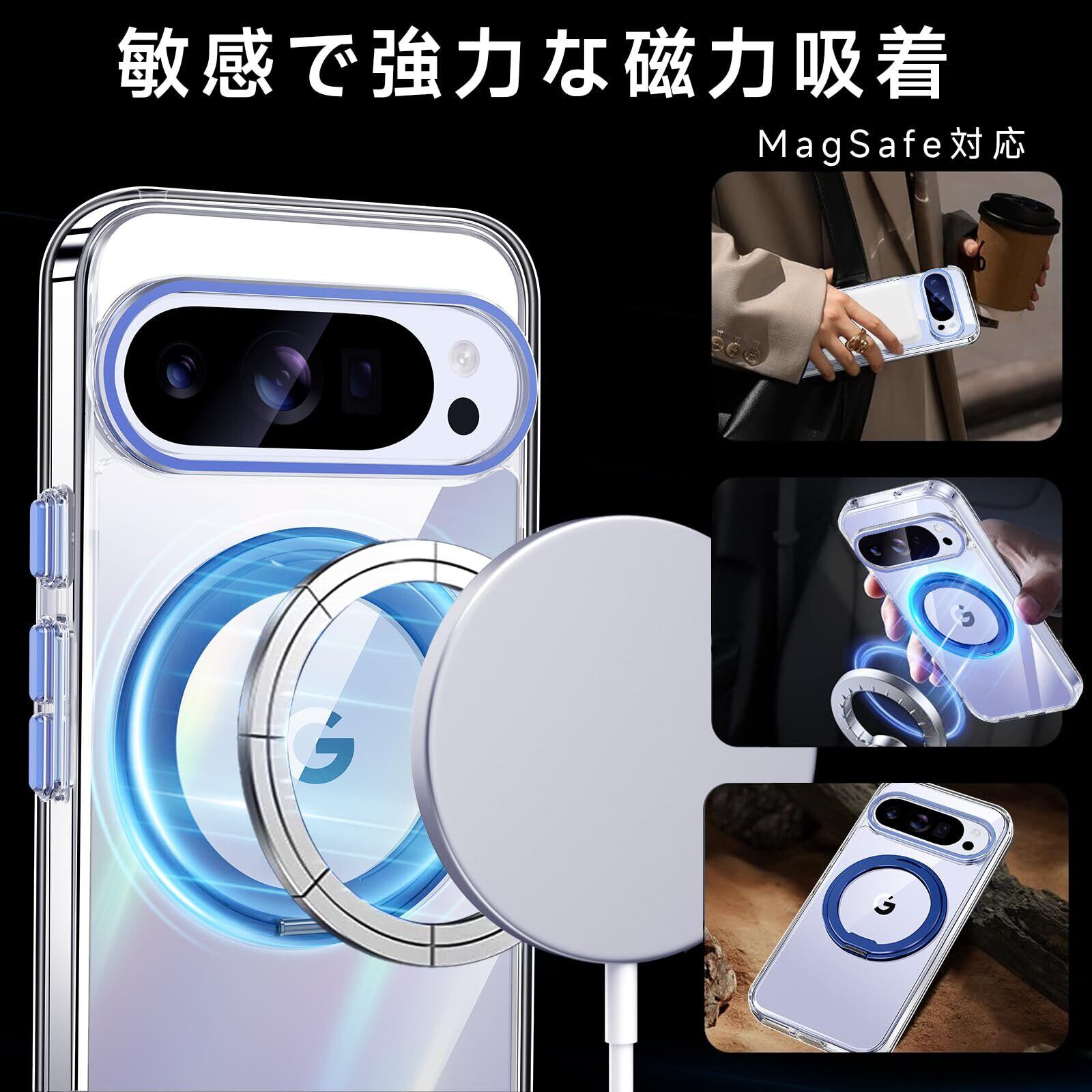 【米軍MIL規格・Magsafe対応】Google Pixel 9 / 9 Pro 用 ケース MagSafe対応 リング 360°回転スタンド機能 縦横両対応 透明 黄ばみ防止 ワイヤレス充電 レンズ保護 耐衝撃 携帯カバー グーグルピクセル9/9プロ カバー 6.3 インチ マグネット搭載 車載ホルダー マグセーフ対応 おしゃれ (クリアブルー)