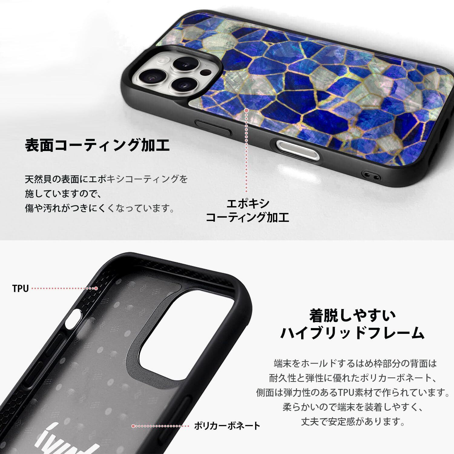 【表面コーティング加工】天然貝の表面にエポキシコーティングを施していますので、傷や汚れがつきにくくなっています。【着脱しやすいハイブリッドフレーム】端末をホールドするはめ枠部分の背面は耐久性と弾性に優れたポリカーボネート、側面は弾力性のあるTPU素材で作られています。