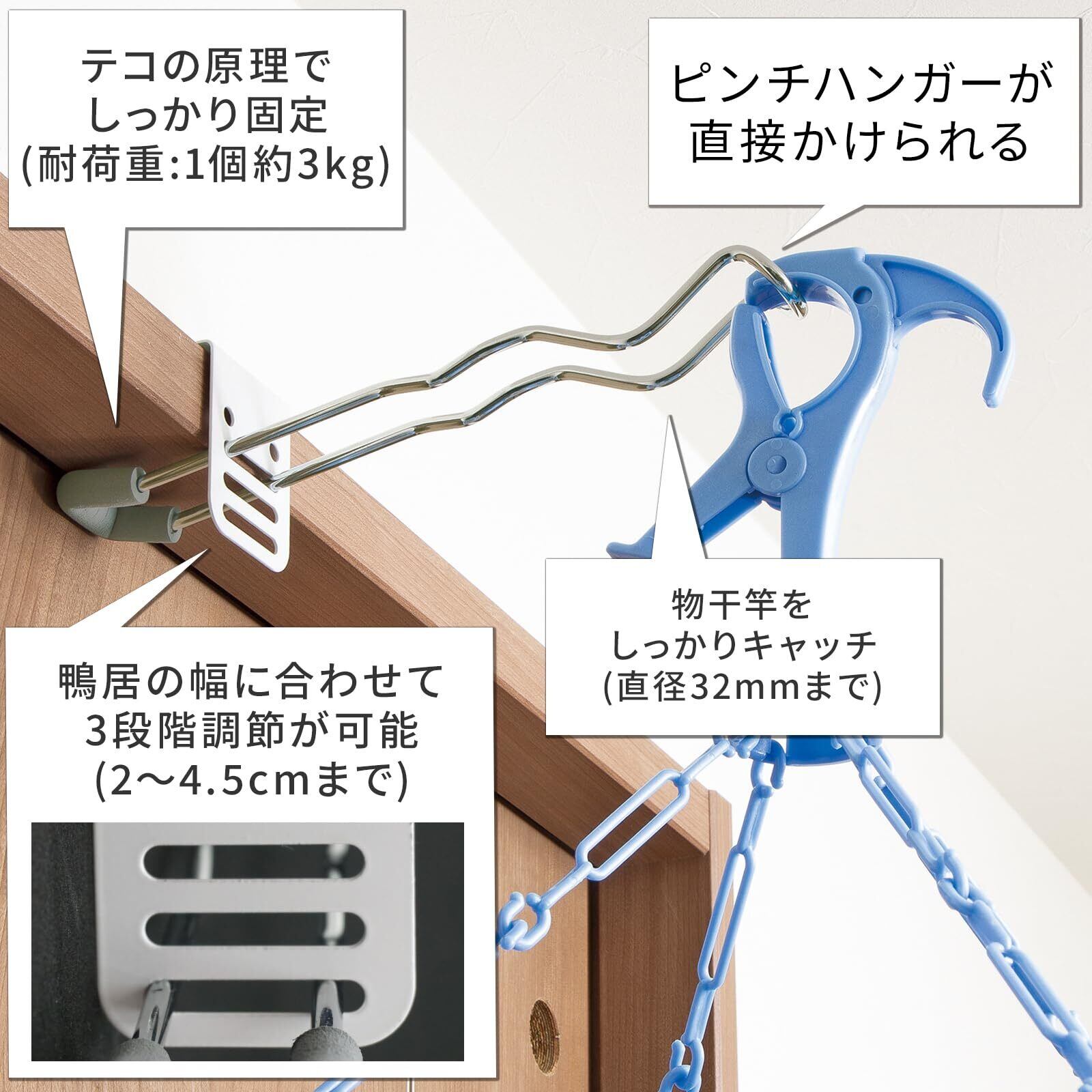 仕様:【耐荷重】1個使用:3kg、2個使用:6kg、※竿・ハンガーは付いておりません。、※取り付け可能な鴨居の幅は2~4.5cmです。