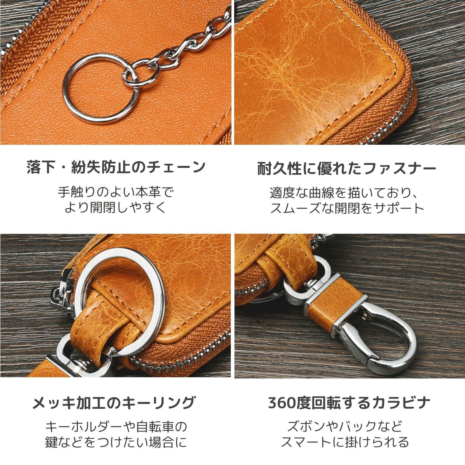 【商品詳細】ラウンドファスナーは高品質の合金製で大きく開くフルオープン式。 手触りの良い本革のスライダーがスムーズな開閉をサポートします。 カラビナは360度回転するためズボンやバックに装着時もからまらずにスマート掛けられます。 キーリングはキーホルダーや自転車など他のカギを付ける際に便利です。 内部には落下・紛失防止のキーチェーンが付いていますので、取り出したい際にも安心。 本体サイズ:8.5 x 4 x 2cm/収納可能なキーサイズ:7.5 x 4 x 1.5cm