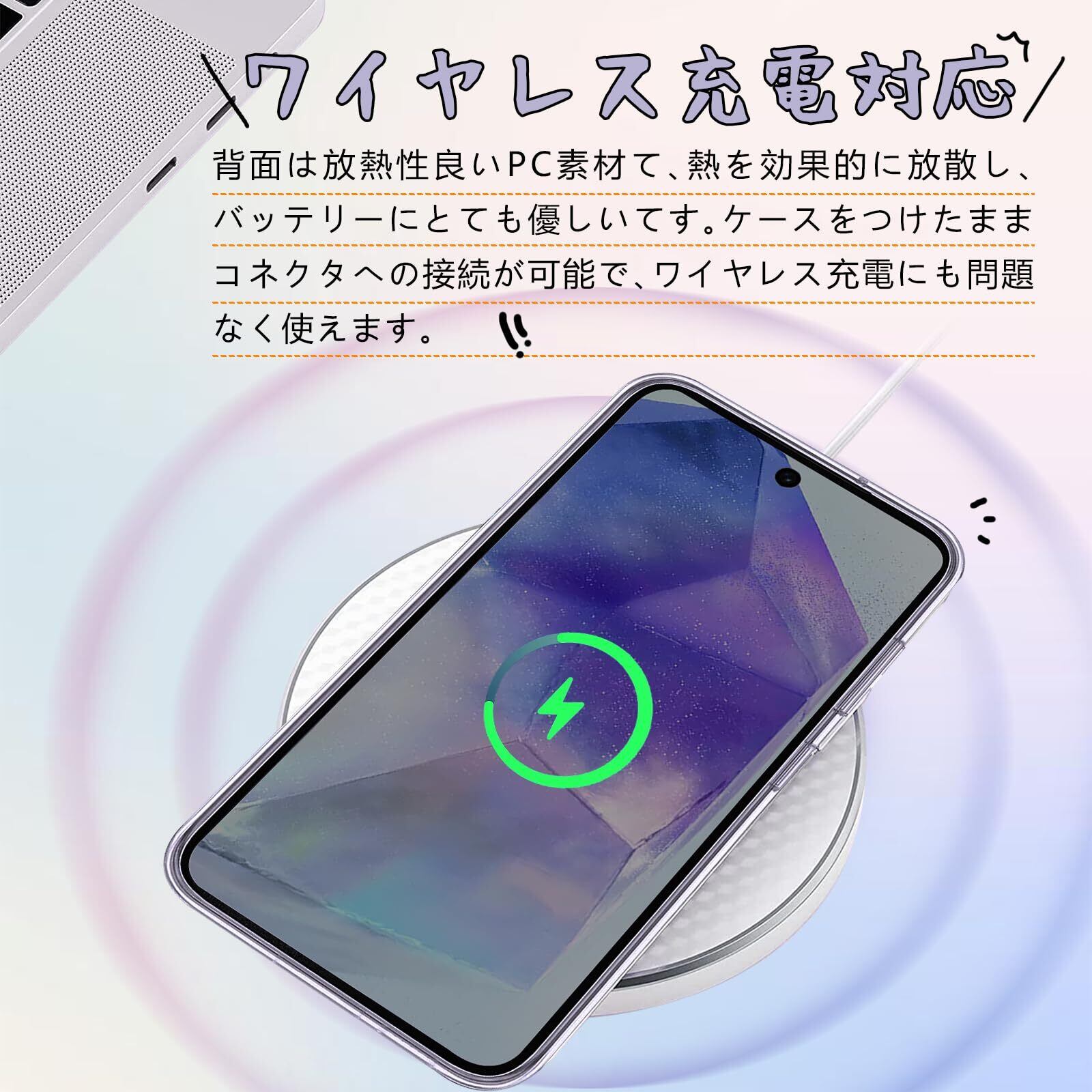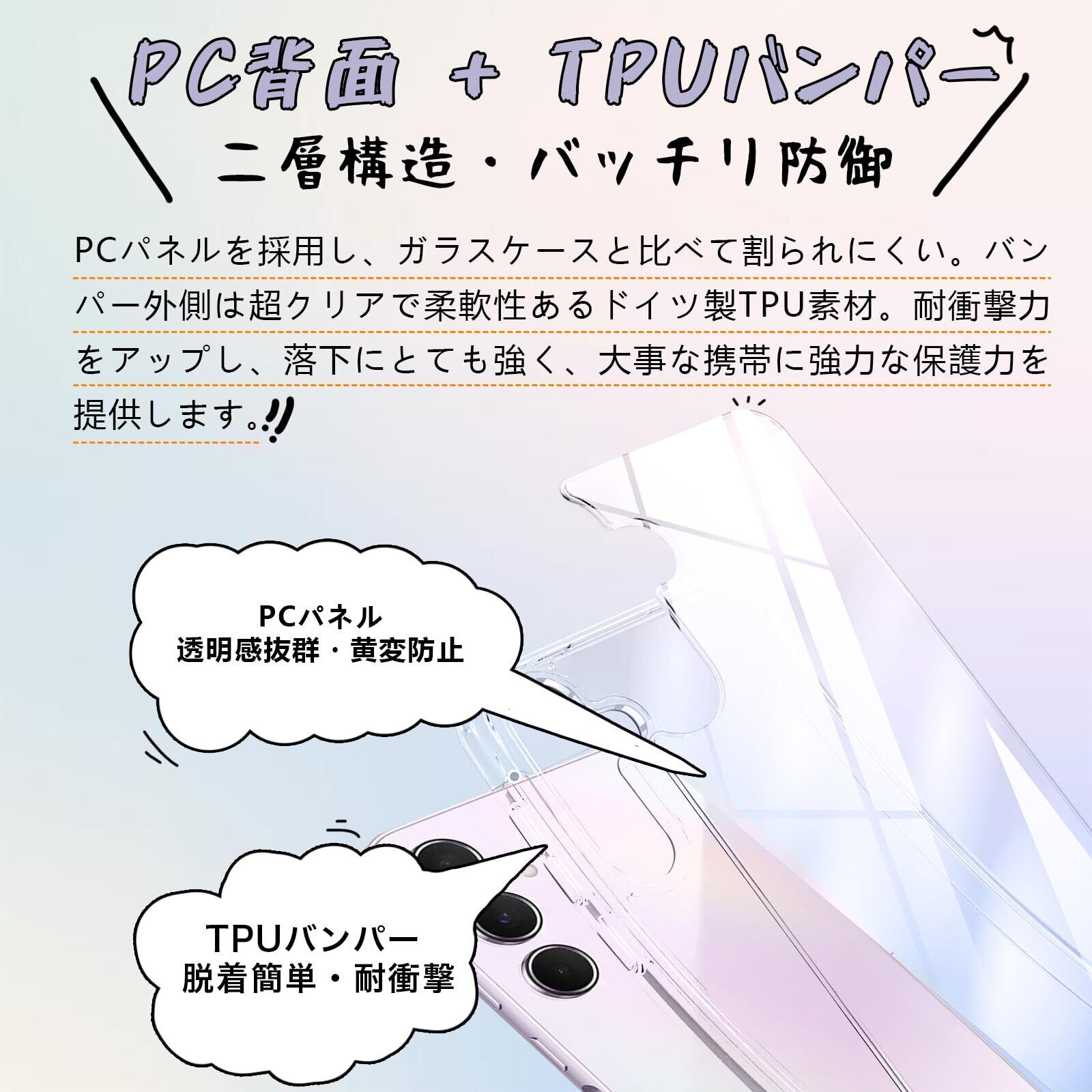 【極上の透明感・黄変防止】ケースは透き通った99%高い透明度を誇り。驚きほどの透明感、美しさをしっかりキープ、Phone本体のカラーを活かせて、背面がクリアなので好きなシールや写真を入れてカスタマイズOK。Phone本体の美しさを引き立たせて端末を衝撃と傷から保護します。ぎゃらくしーA55 用ケースは黄ばみに強いソフトTPU素材と耐候性に優れたPCパネルを厳選し、研究データにより、黄変耐性が普通製品より20倍も高く、従来手法よりも88%の黄変防止を達成した。経年劣化による黄ばみも生じないから、澄み切った光沢感は、人を惹きつけてやみません。
