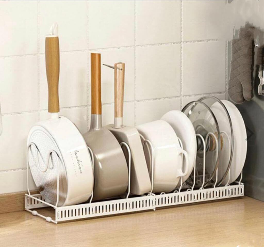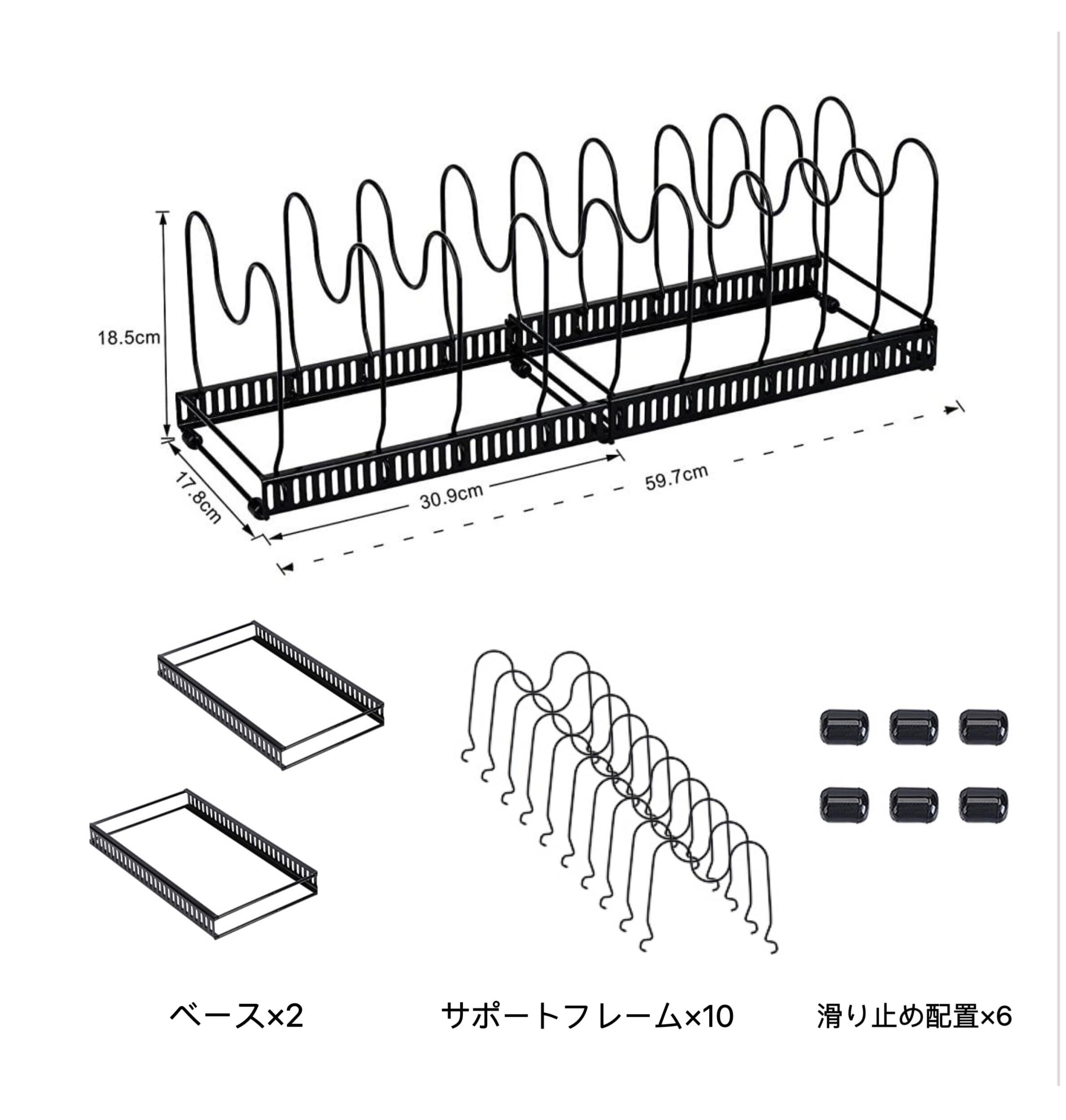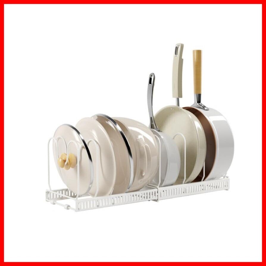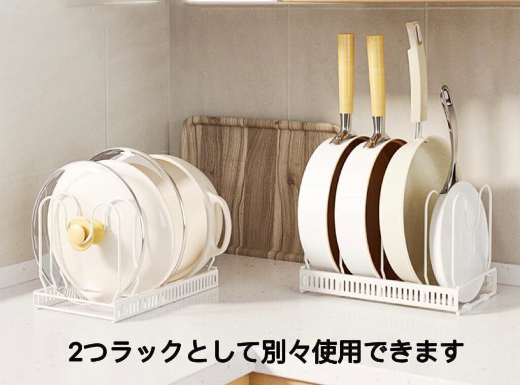【組み立て簡単】:鍋のサイズに合わせて、サポートフレームを本体のスロットに差し込むとこていできます。組み立てはとても簡単です。サポートフレーム10本が付属しており、フライパン、鍋や蓋などのサイズに合わせて調整可能です。最大9個のフライパンを収納できます。