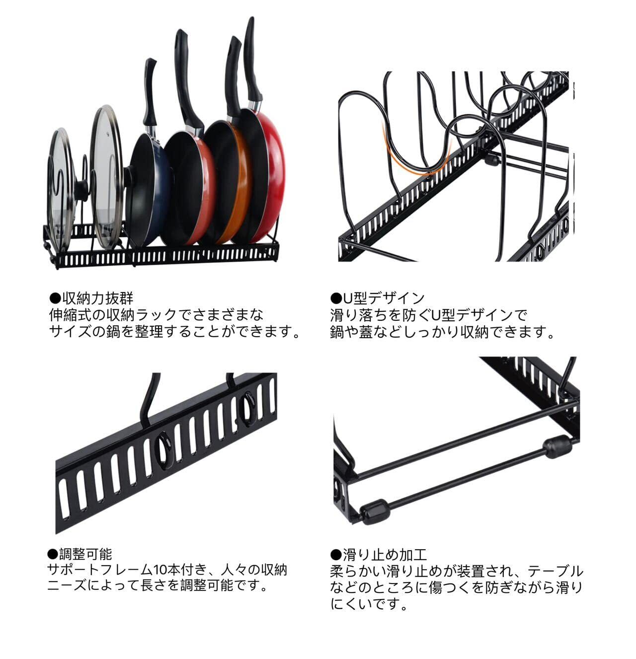 【伸縮式ラック】:ラックの幅は30.9〜59.7cmまで調整できます。シンク下や流し台、場所によって自由に幅を調整できることのでとても便利です。サポートフレームはM型に設計されて、鍋蓋をしっかり固定できたうえ、取り出しやすいです。