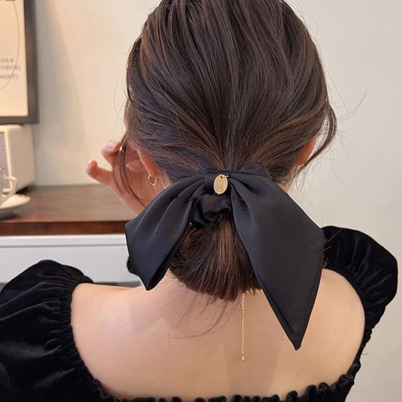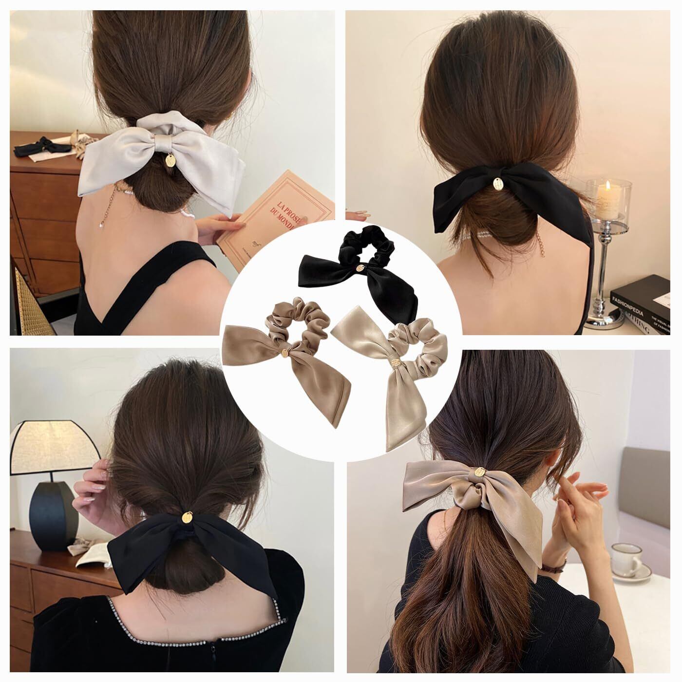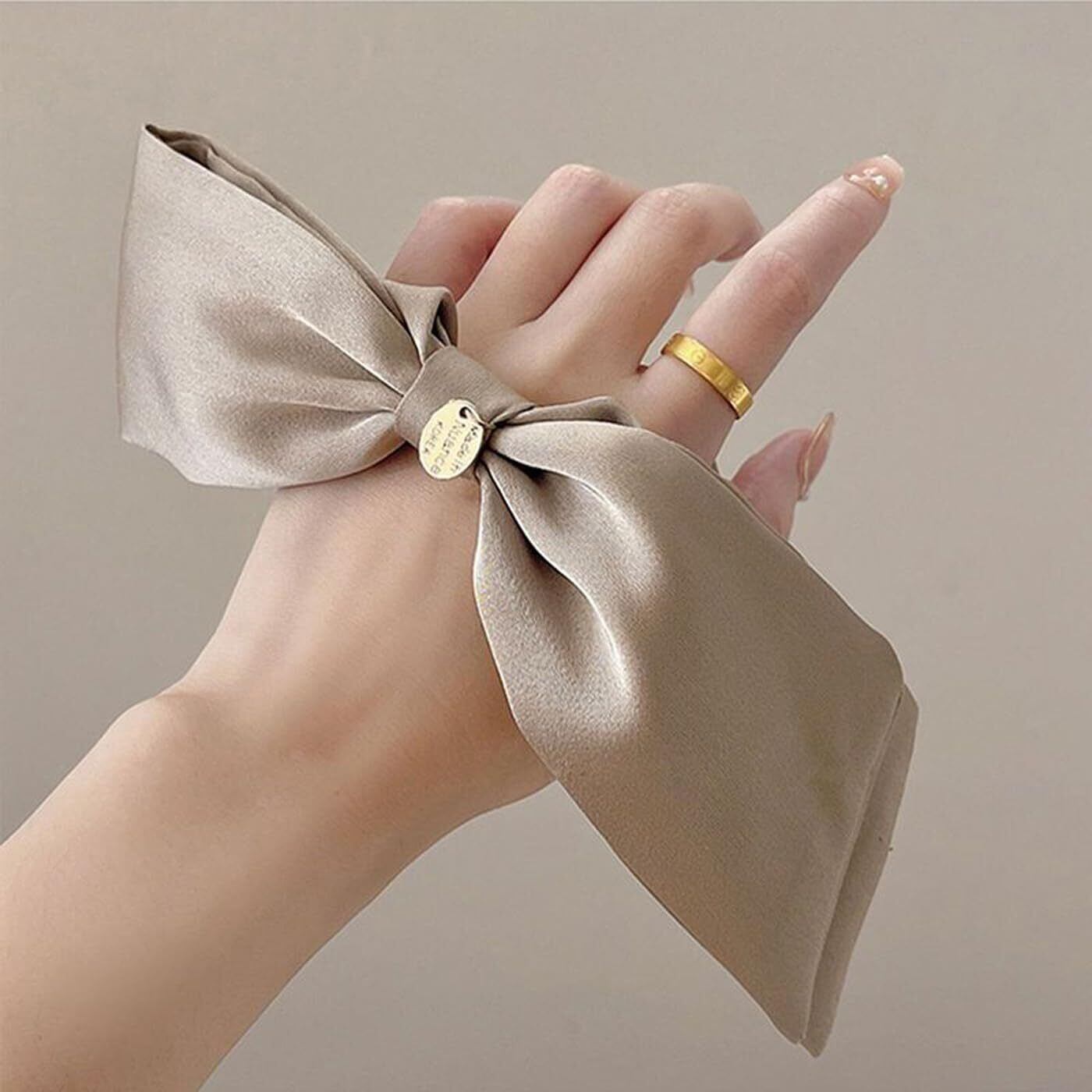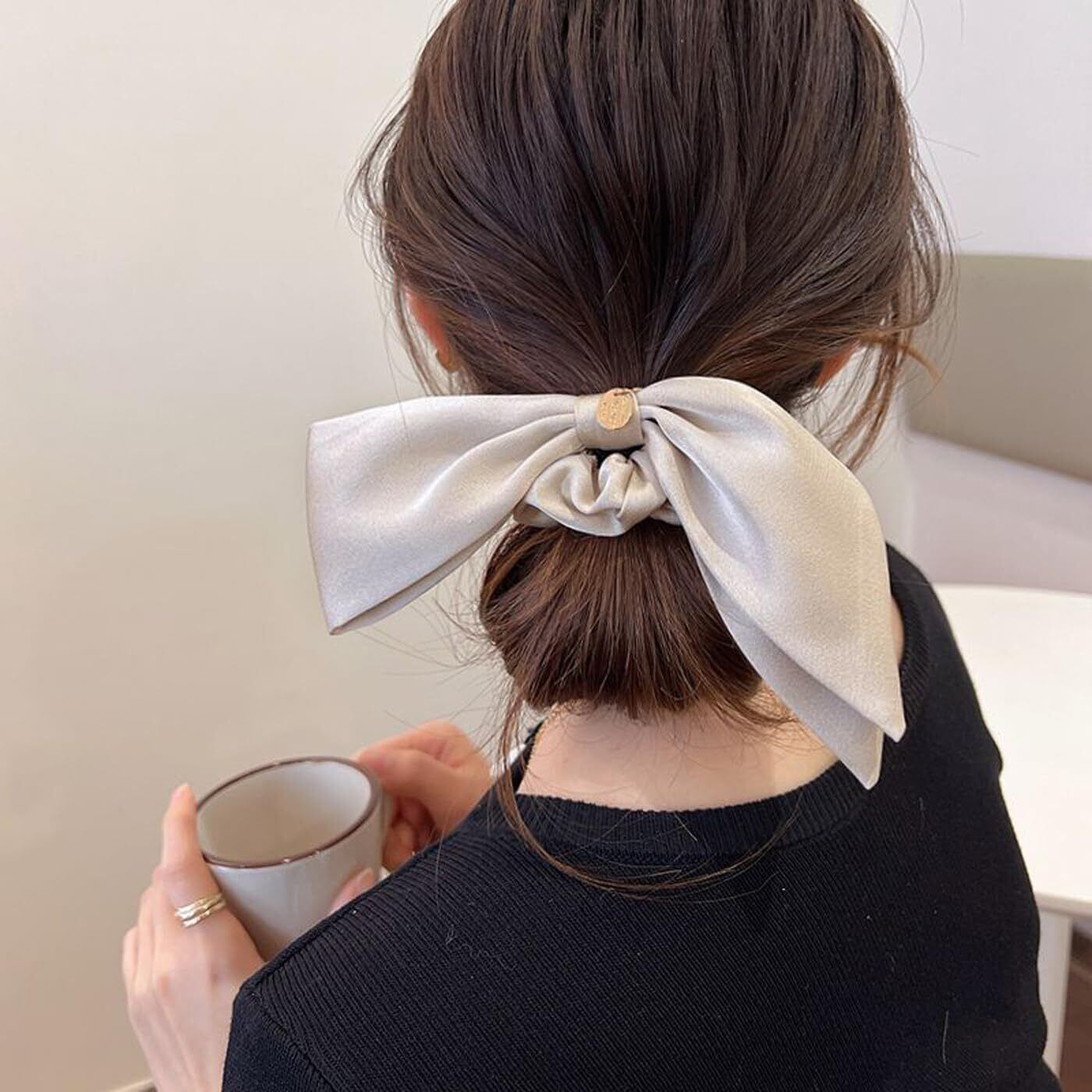 【ユニークなデザイン】:シルクリボンのデザインがユニークで、リボンとシュシュの2つの部分が組み合わされて、とても優雅です。ロングリボンは小顔を引き立てる効果があります。