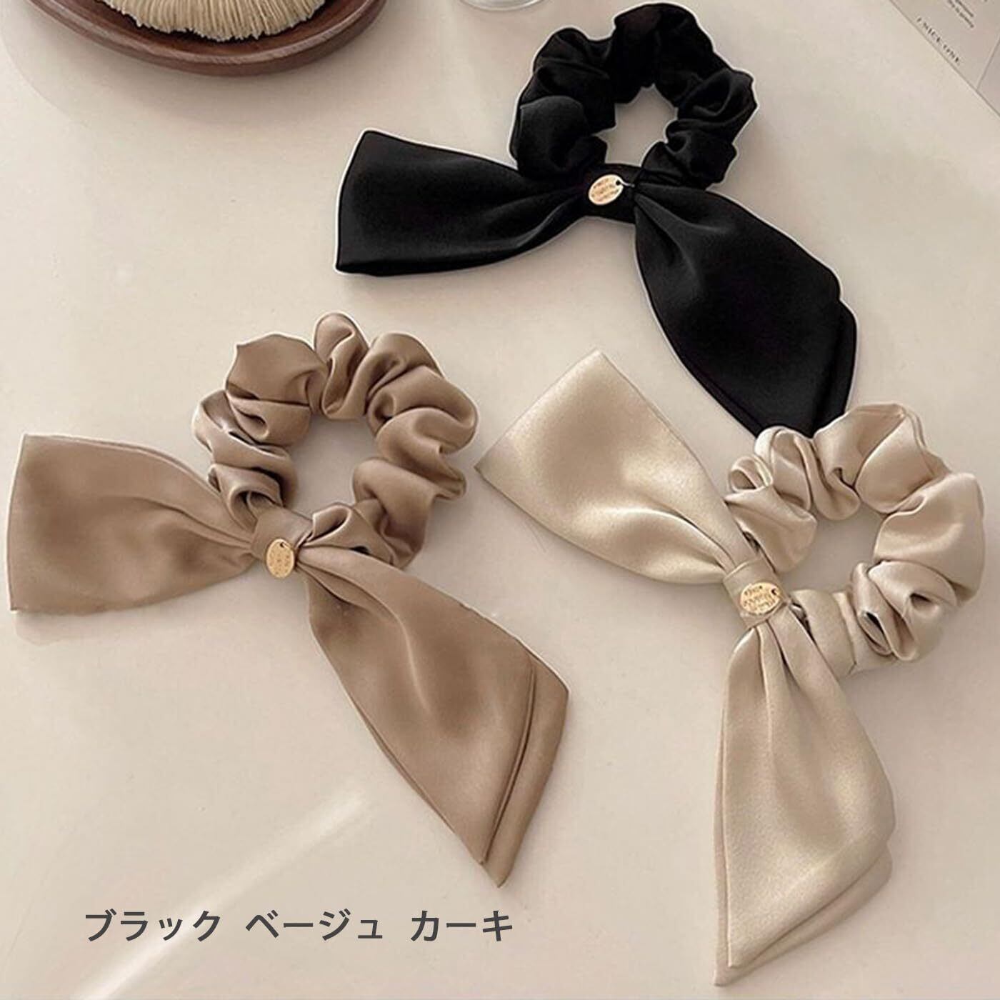 【商品詳細】:リボン ヘアゴム 3個、ブラック、ベージュ、カーキ。サイズ:縦約20 cm、横約8cm。とてもエレガントなデザインは、どんな甘い女の子の服装にも合います。