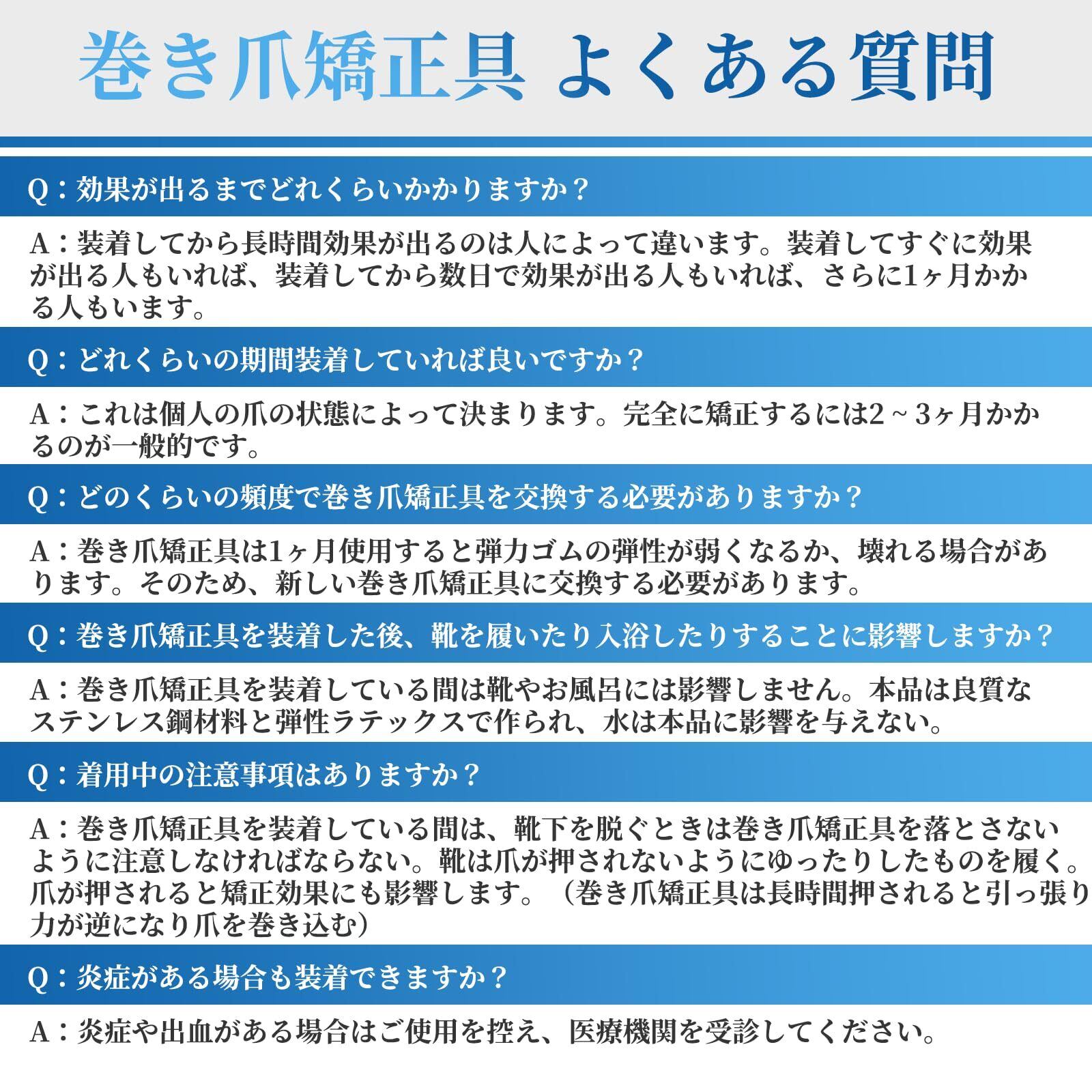 【有効期間】本品は約30日間使用すると、弾性ゴムの弾力性が低下しますので、新しい製品に交換するのはおすすめです。軽度に爪が陥入している方は、本品を1〜2ヶ月装着する必要があります。重度の方は、本品を2〜3ヶ月装着する必要があります。※個人の爪の状態によって決まります。