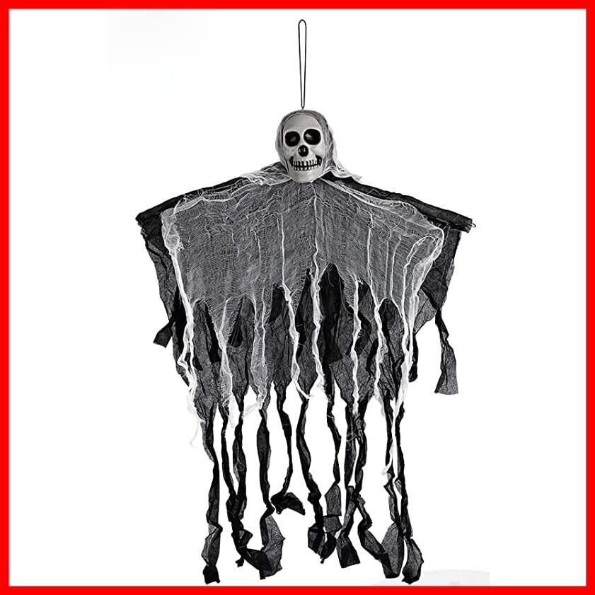 【雰囲気満点】:ハロウィンの怖いハンギングゴースは、ホラーパーティーの装飾には絶対にかかせないアイテムです。主に頭蓋骨と布で構成されています。アームは柔軟に調整できます。ぼろぼろの布が風に揺れ、ハロウィン気分満喫でき、ハロウィーンパーティーを盛り上げ、人々を怖がらせました。