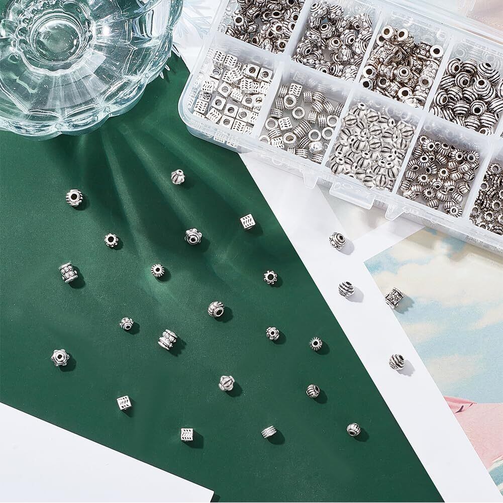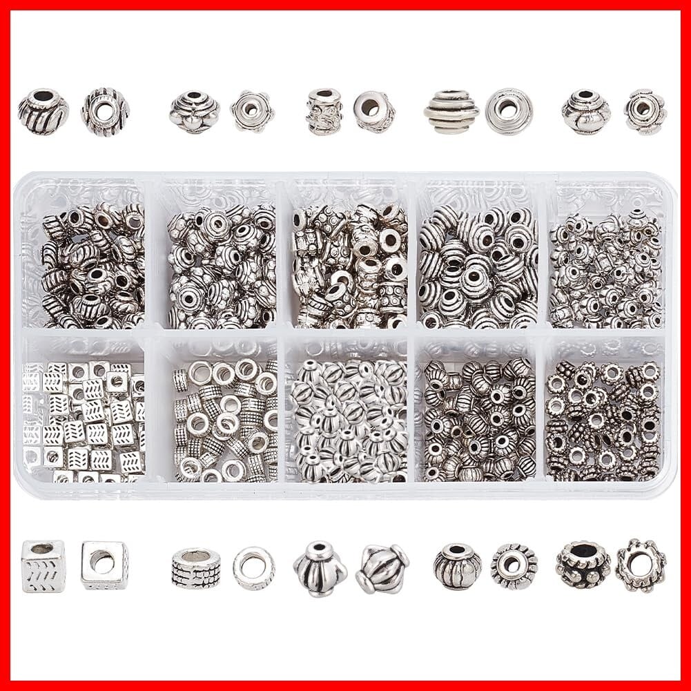 【10種&約500個】:10種類(カラム、ロンデル、ランタン、キューブ、バレル、そろばん、花など)のアンティークシルバーシリーズのスペーサービーズが揃っており、また各種が約50個入っており、結構豊富で大容量なチベットスタイルビーズセット!