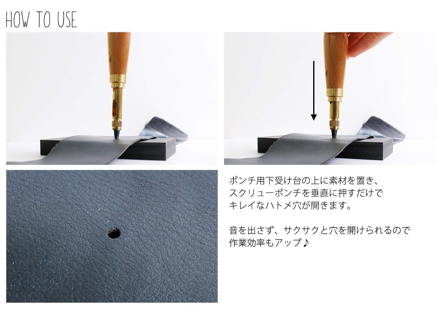 革、布、ゴム、紙(製本)などにきれいな穴が開けられるスクリューポンチ(NS-SP)の専用替え刃です。トンカチなどの打ち具が要らないので、音を気にすることなくハトメ穴を開けることが出来ます。刃が回転して穴を開けるので、初心者の方にもおすすめです。