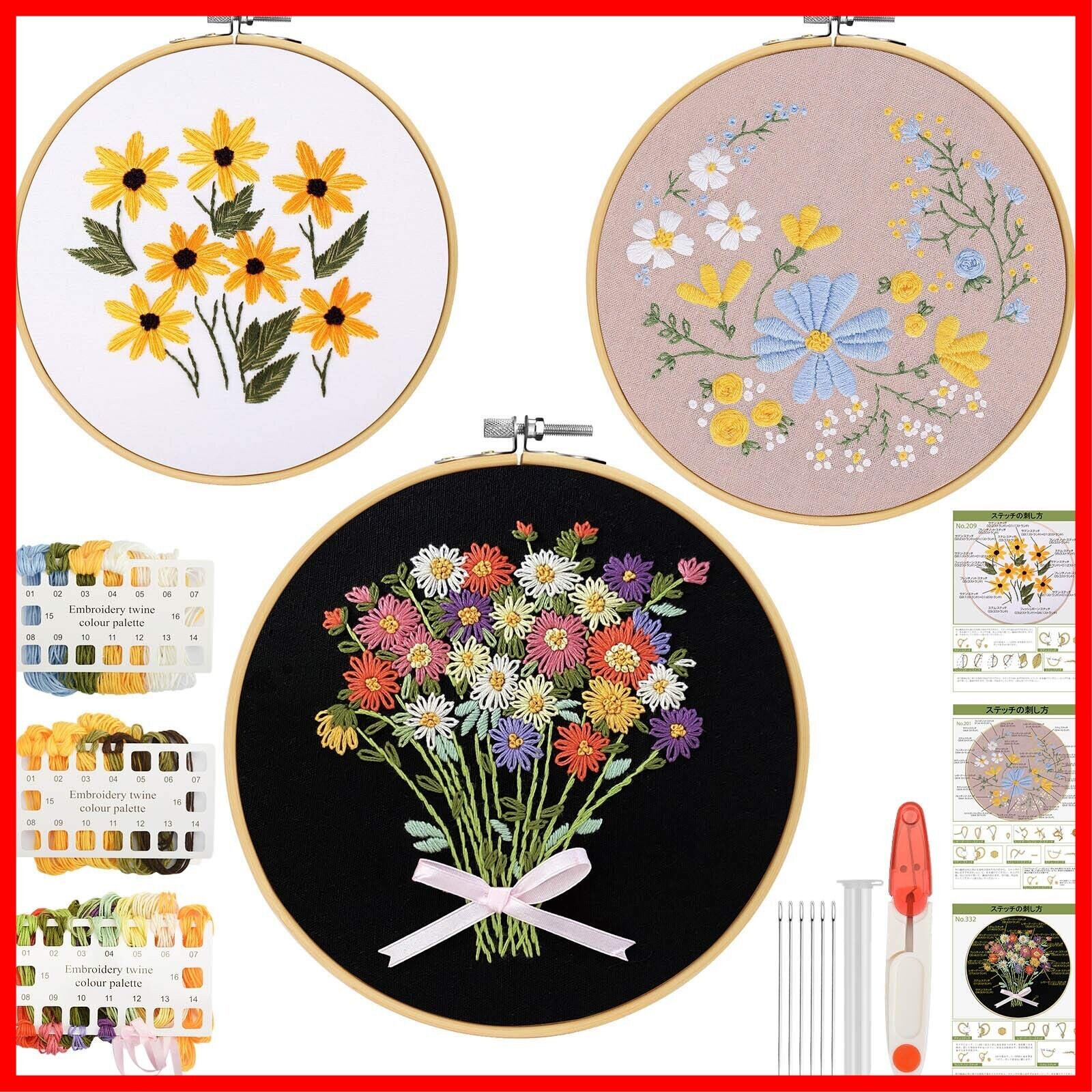 mefeny 刺繍キット 刺しゅう 初心者 パターンあり 英語と日本語ステッチ方説明書付き 3セット 竹製刺繍枠3本15CM/18CM/20CM 刺繍糸 刺繍針6本 刺繍布3枚 ハサミ1本 初心者学ぶ 花