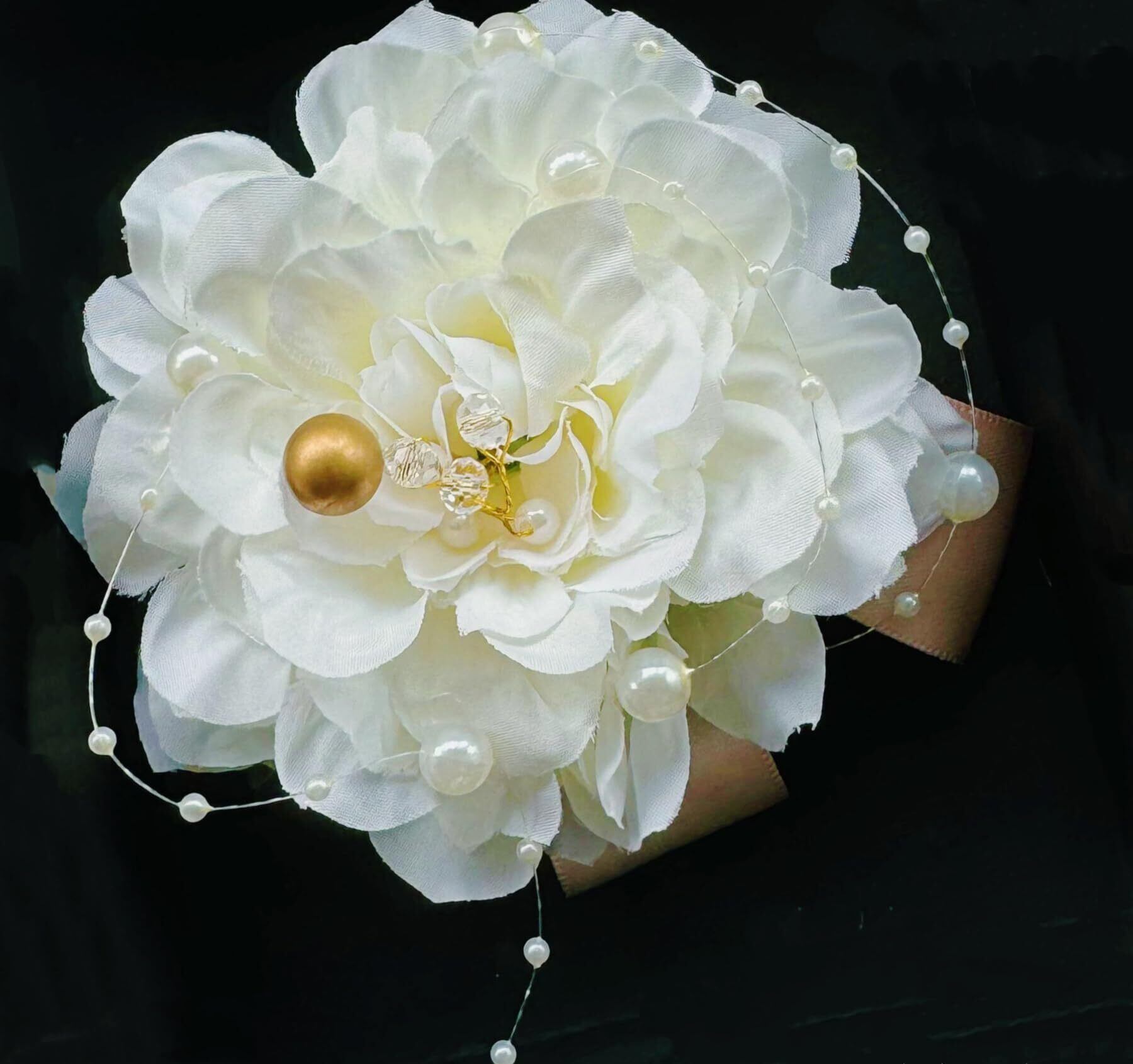 デザイン: 純白のエレガントな花びらにパールとビーズをあしらった上品なフラワーコサージュ
