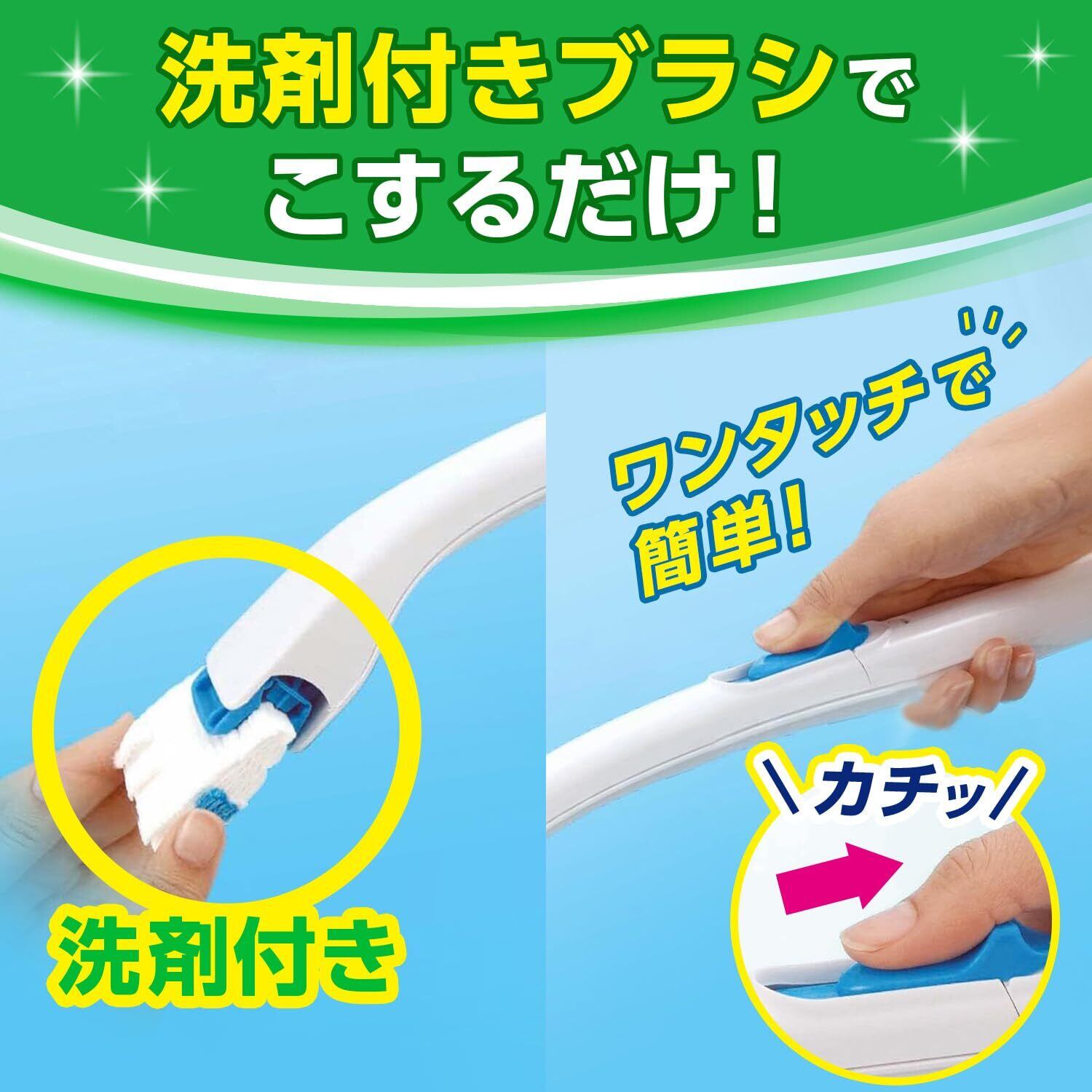 ●1回ごとの使い切りで、お掃除が終わったらそのままトイレに流せるから、いつでも清潔!ブラシはワンタッチでカンタン着脱。