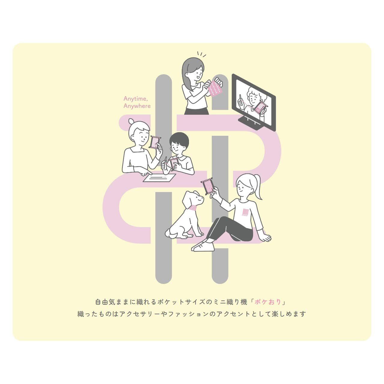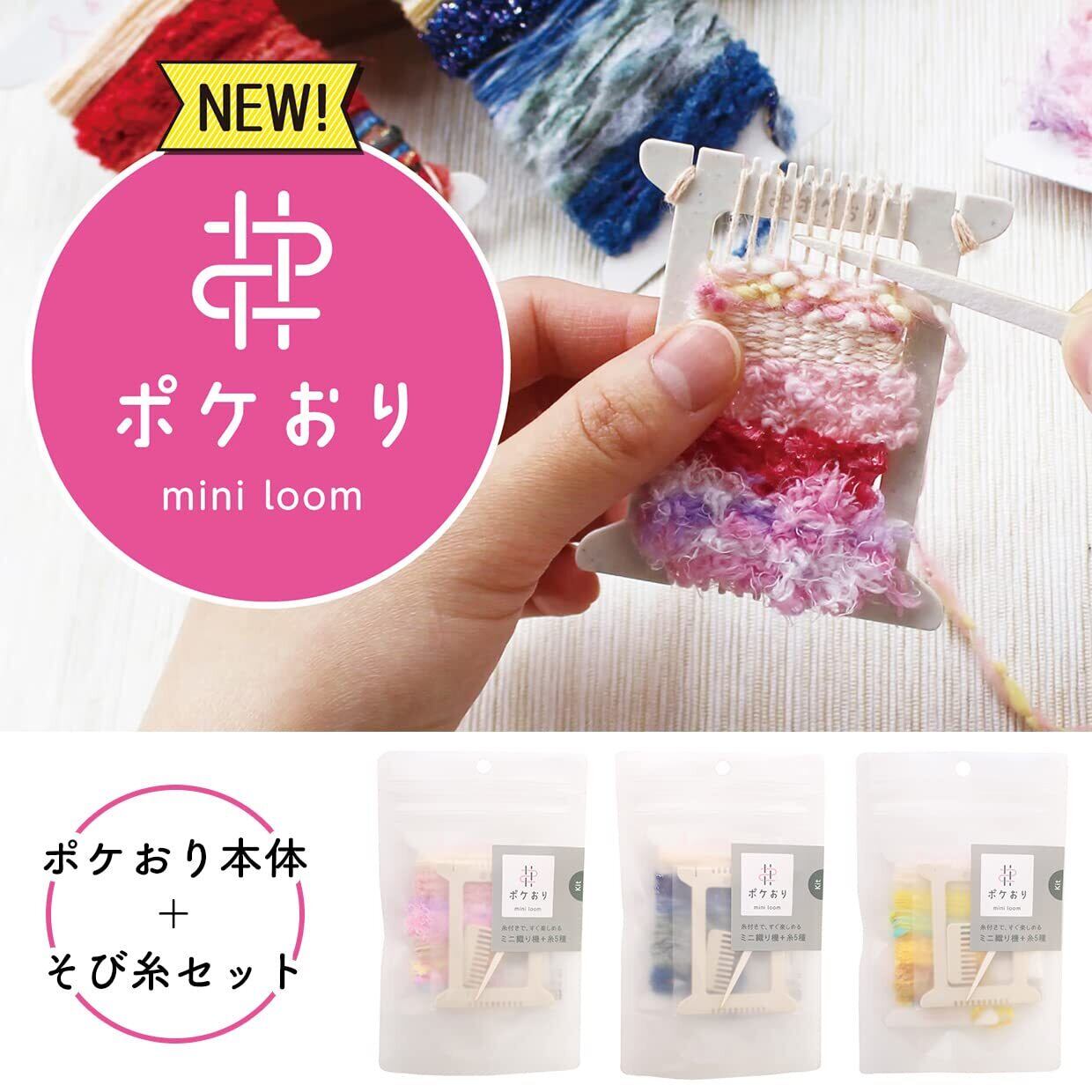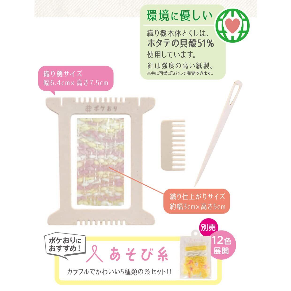 素材:織り機本体・くし/ホタテ殻、ポリプロピレン、針/紙、糸:綿、ウール、ポリエステル、ナイロンなど