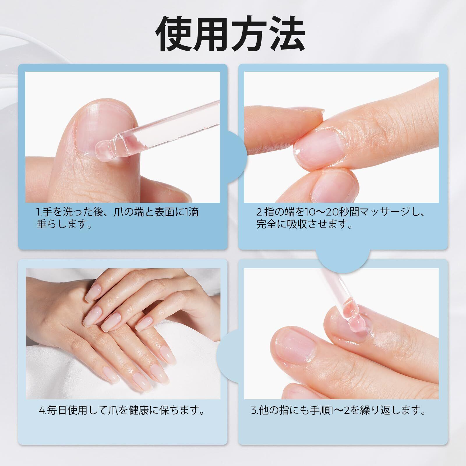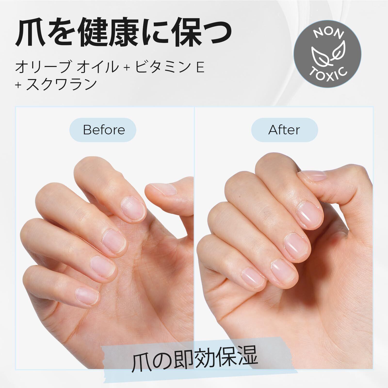 栄養補給と修復: 傷んだ爪、硬くなった爪、乾燥した爪に塗るだけで簡単にケアできます。爪を補修・ケアし、爪の健康をサポートします。爪の端やささくれができやすい部分の乾燥した肌に塗ります。指で優しくこすってマッサージすることで、肌への吸収を促進し、肌に栄養を与え、角質の状態を改善します。