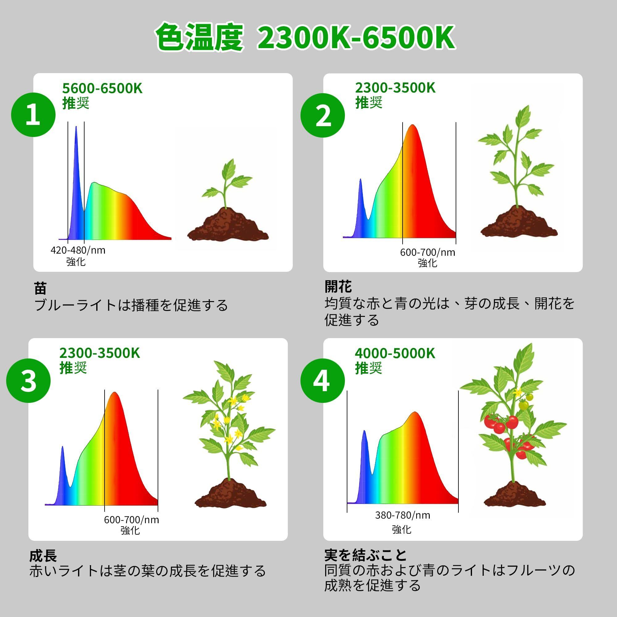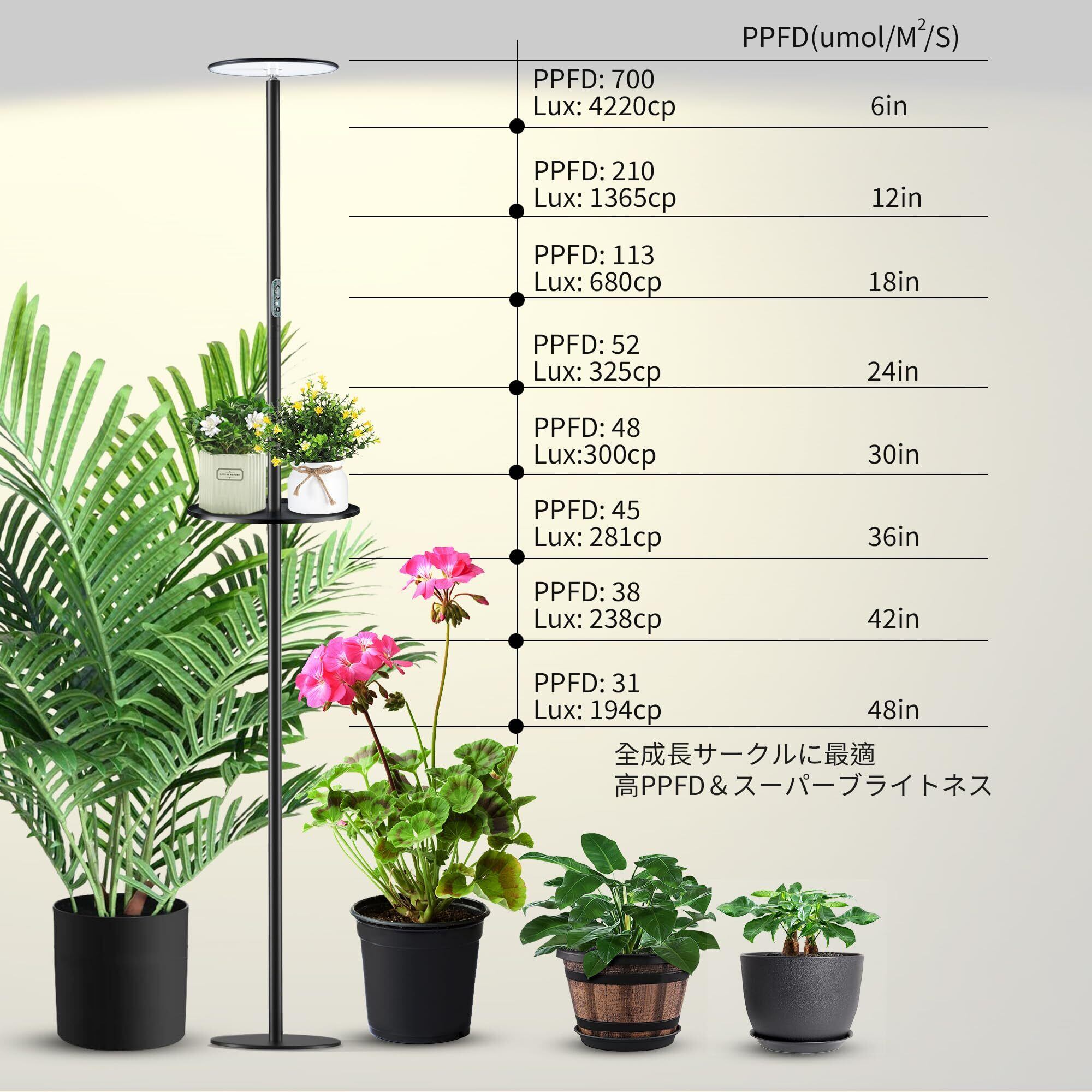 【調節可能な色温度及び明るさ】私達の 2300K -6500K 色温度の完全なスペクトルの成長するライトは自然な日光を模倣し、すべての段階のための植物の健康な成長を促進します。高さ調節可能22''/39''/54''/69''で、小型・中型・大型の植物にフィットします。1%から100%まで、10段階の明るさ調節が可能。90度の角度で、必要な植物により広い照明を提供。リモコンやタッチパネルで簡単にコントロールできます。
