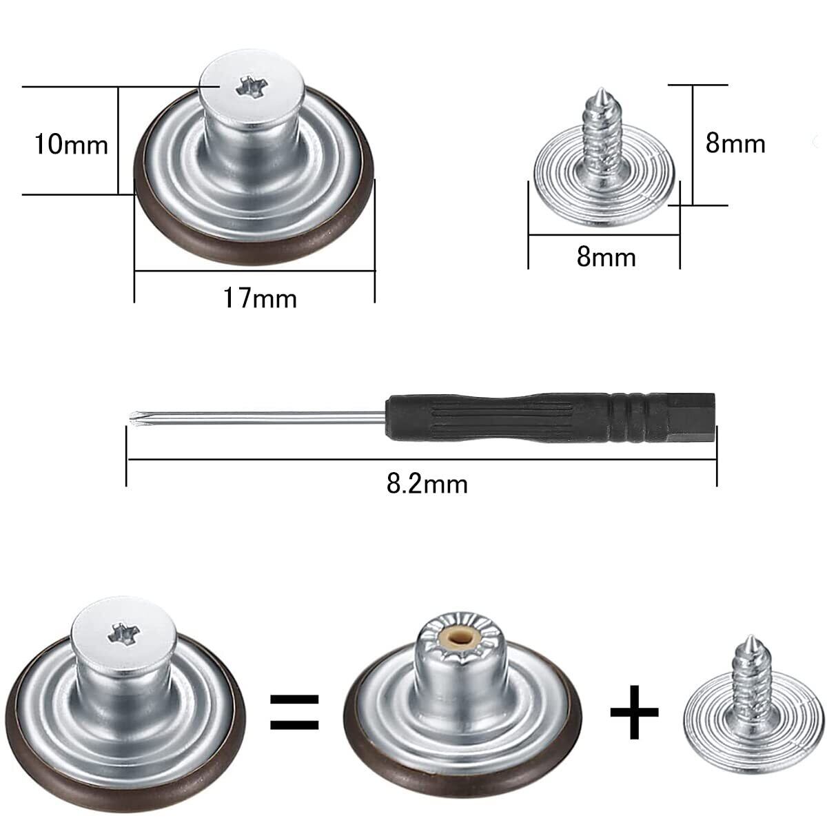 BTtime ジーンズボタン 金属ボタン 17mm 10個セット ネジ式 ジーンズ用 簡単取付け DIY 手作り 延長と縮小可能 専用ドライバー付き (シルバー)