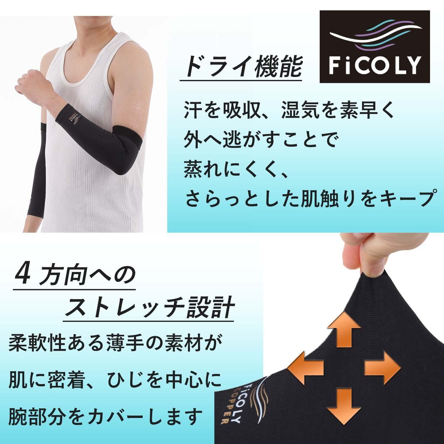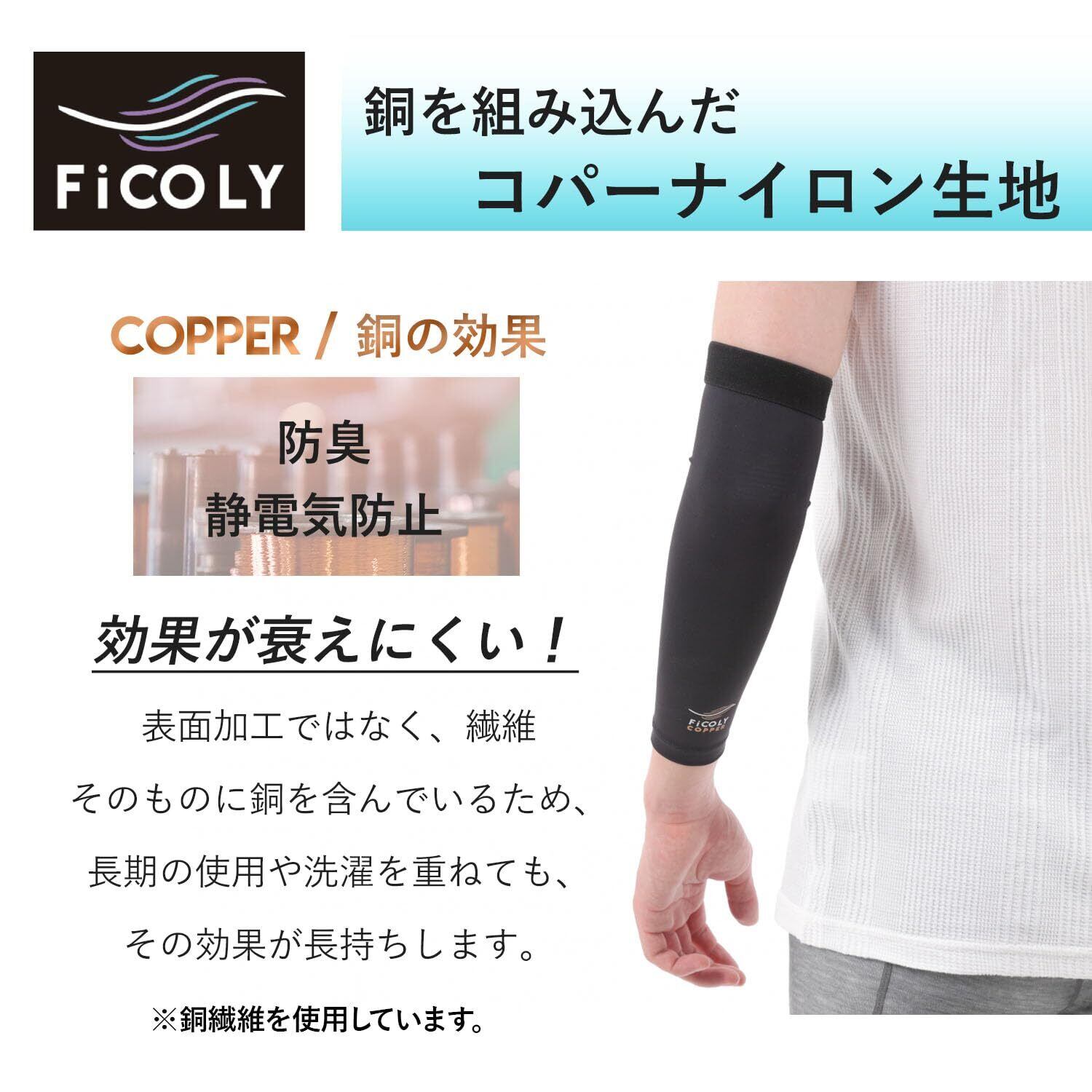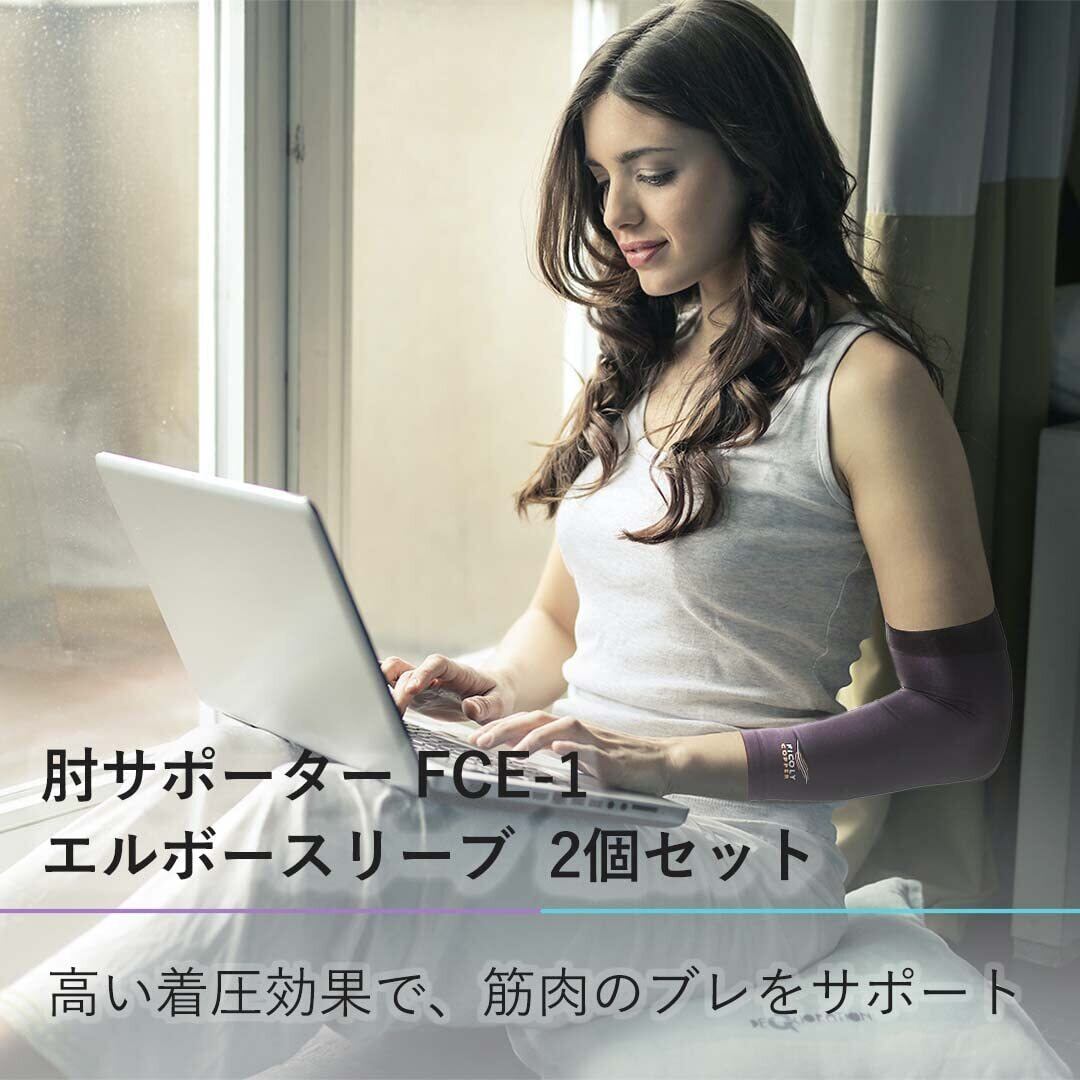 【FiCOLY 肘サポーター エルボースリーブ FCE-1】肌に密着、コンプレッション機能で肘や腕の筋肉の余計な振りを抑える着圧スリーブです。薄手で吸湿速乾、ストレッチ性のある生地には、銅繊維を織り込みました。日常生活に加え、ランニングや野球、筋トレなどあらゆるスポーツの際にも着用していただけます。両腕用の2枚セットです。
