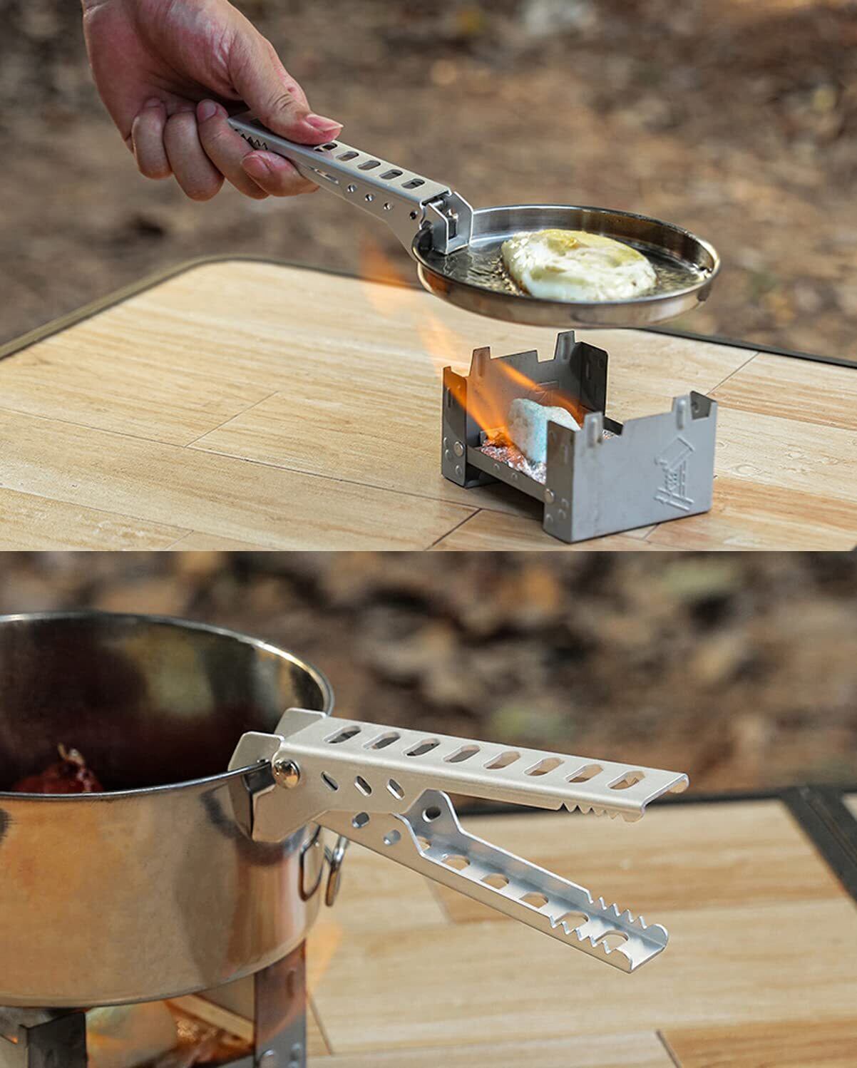 【クッカー取手】ヒンジ側はクッカーを挟む形状になっており、焚火で熱くなったクッカーを挟み取手として使用できます。1つ2役で意外と重宝します。