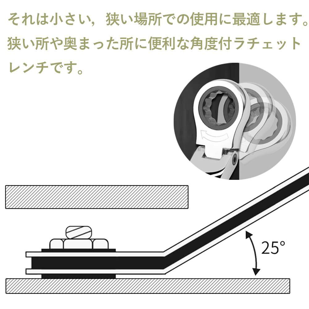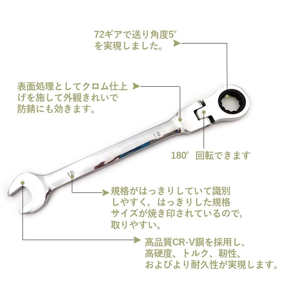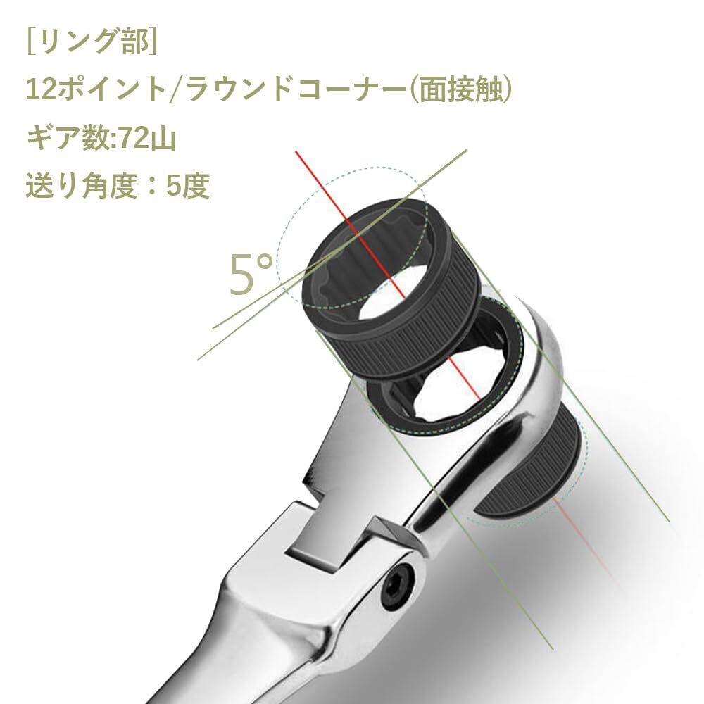 【コンビネーションレンチ】一端はやり形スパナ、一端はラチェットレンチ。メガネ部は72山ギヤと12角サーフェイス採用で、首振りタイプで0~180°角度調整できて、さまざまな位置や角度で使用することができます。