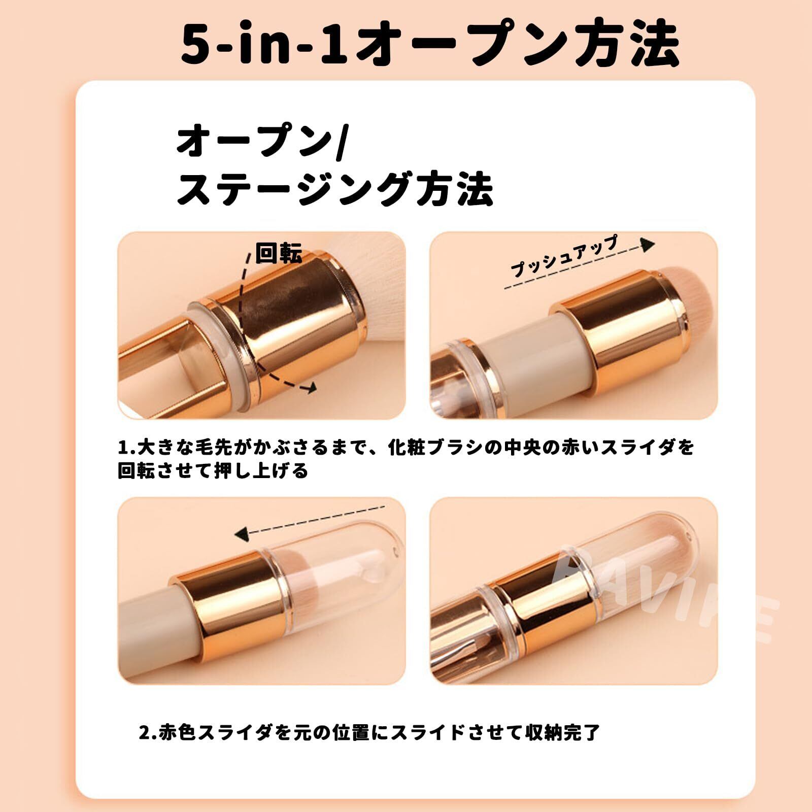 【5-in-1メイクブラシセット】5種類のブラシが含まれており、簡単なメイクニーズに満たすことができます。通勤メイクやすっぴんメイクには、このメイクブラシセットを使い、完璧なメイクが完成できます。