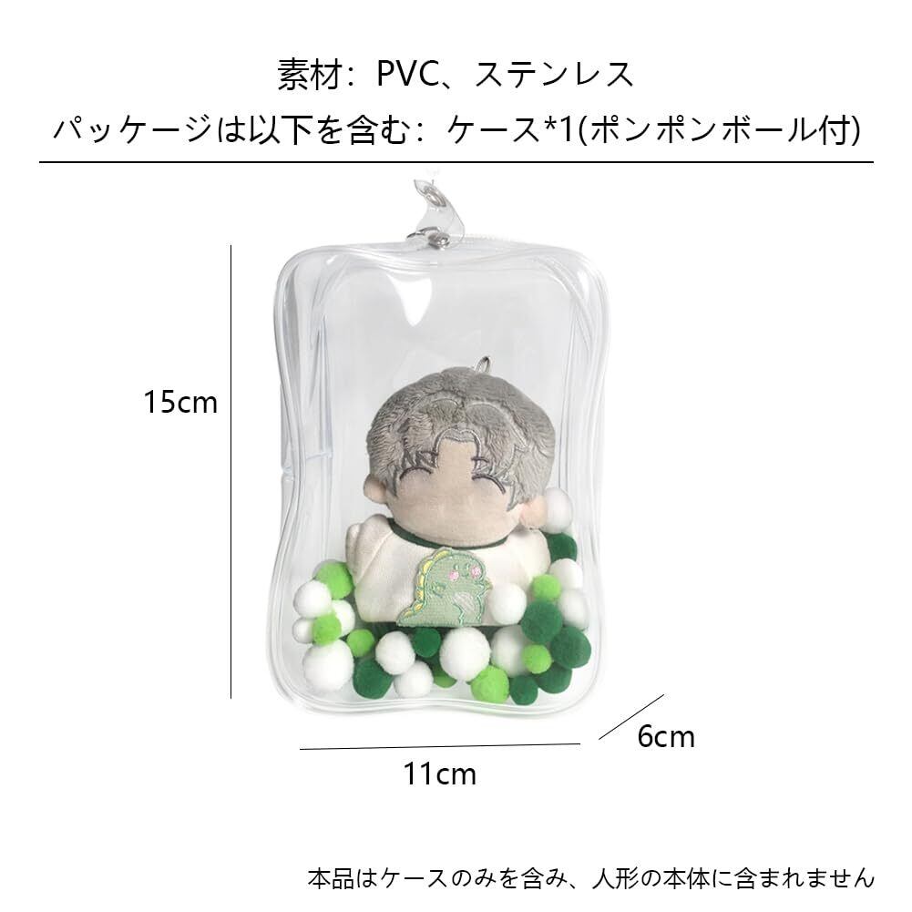製品名前:完全透明・人形外出用ケース。素材:PVC、ステンレス。形・サイズ(高さ):四角・ポンポンボール付・15cm。パッケージは以下を含む:ケース*1(ポンポンボール付)。