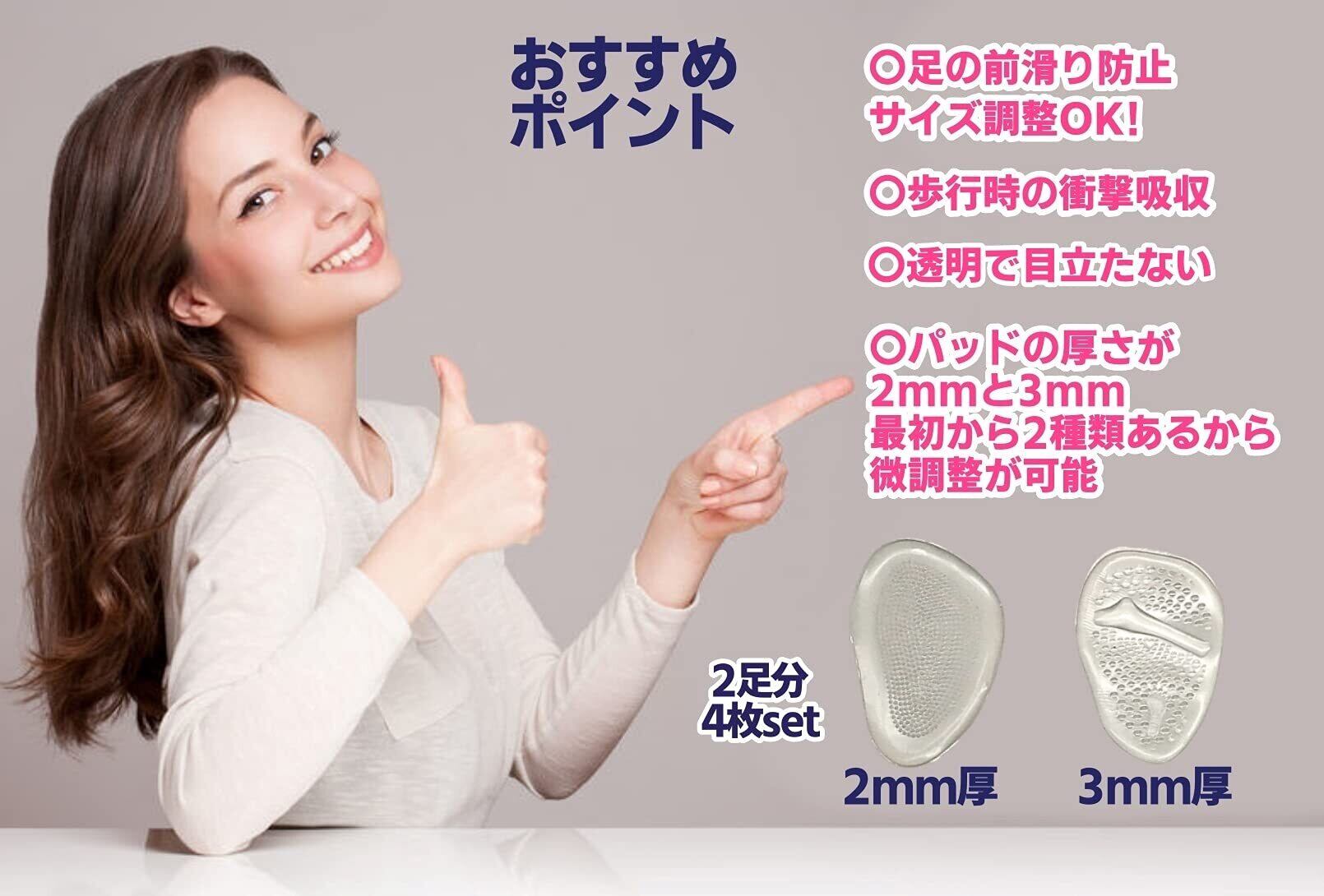 つま先インソールは2mm厚と3mm厚の2足分(4枚)セット!厚さが違う、つま先インソールが最初から2種類あるので、靴に合ったサイズの微調整が可能! 靴のタイプに応じていろいろと試めして、ぴったりフィットを実感して下さい。