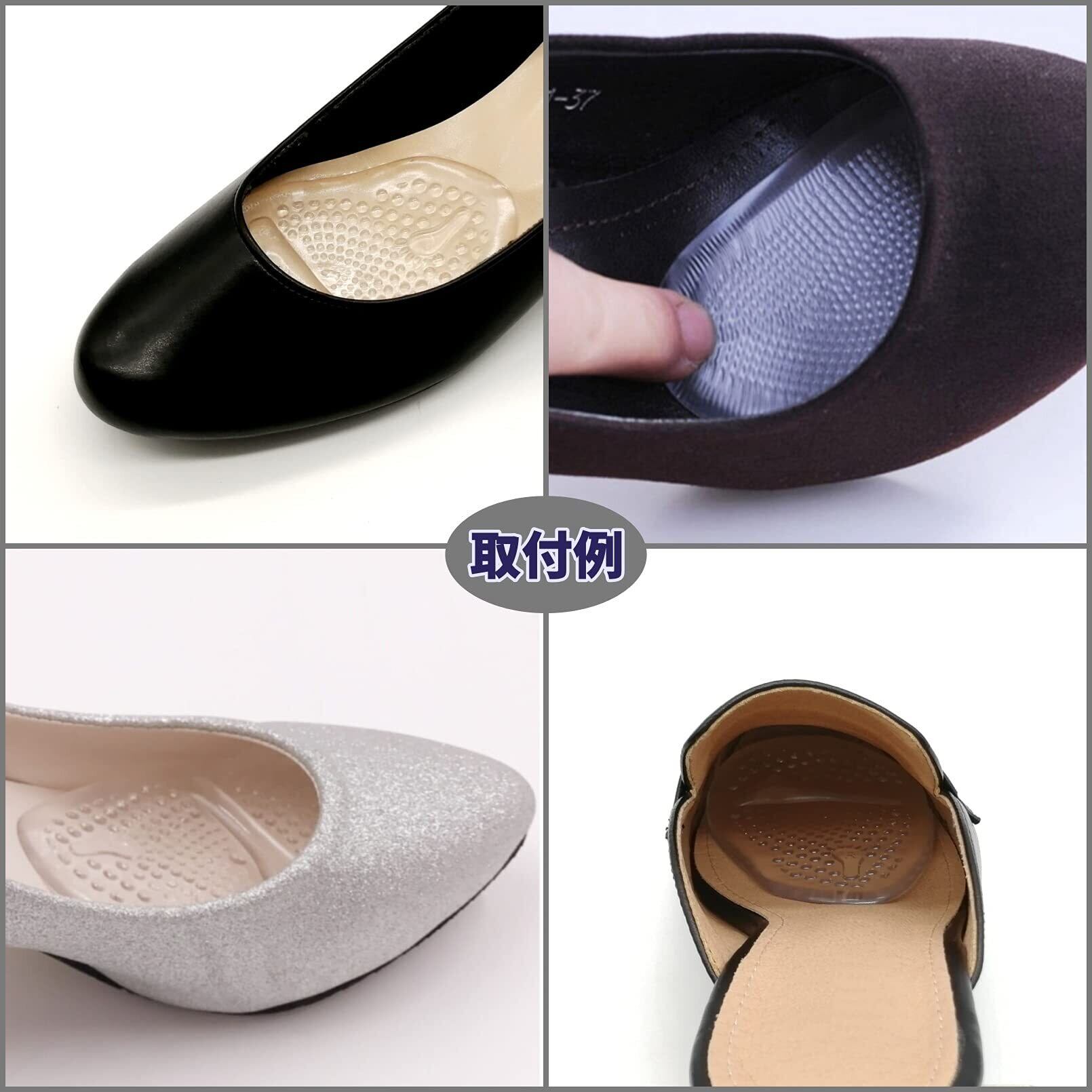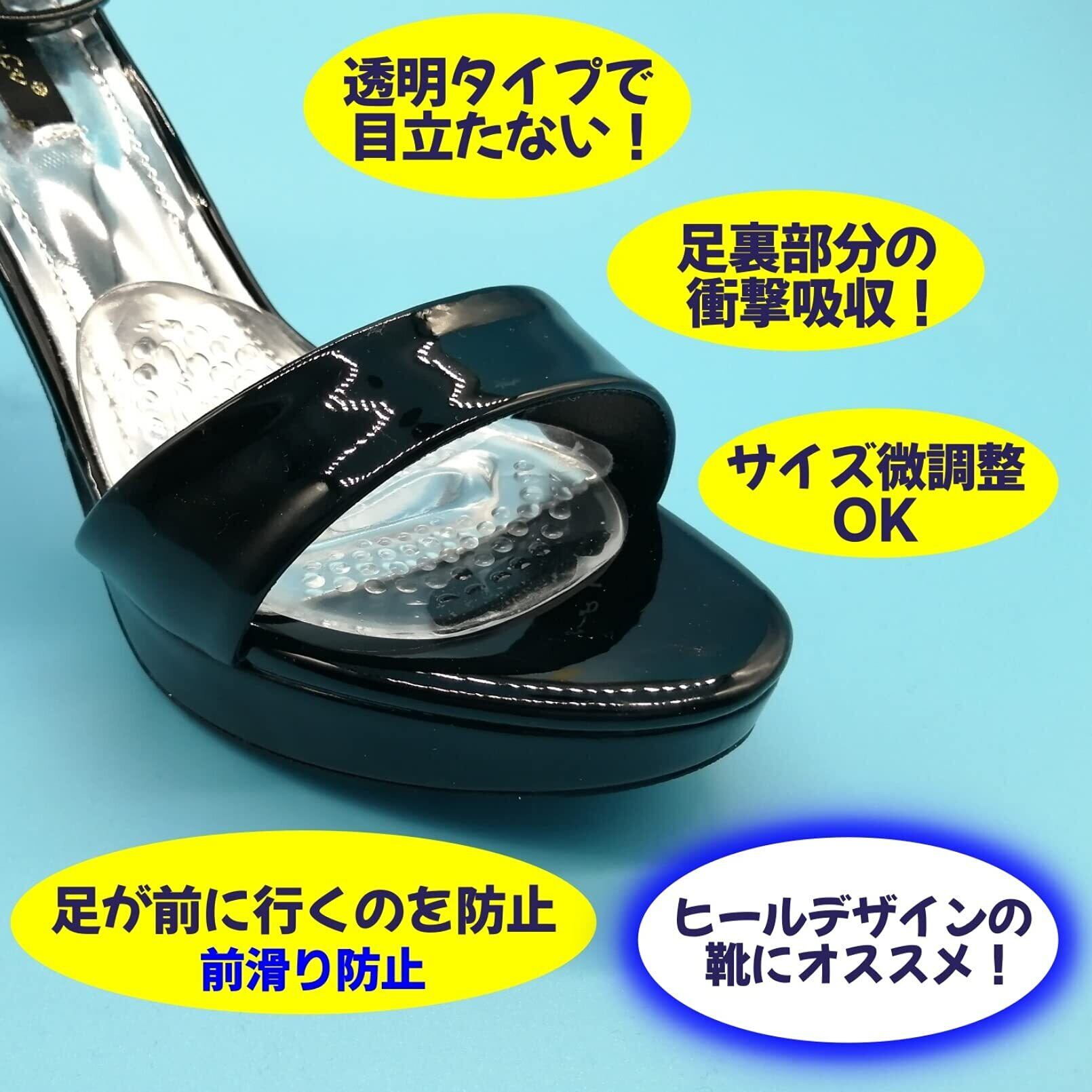 ヒールデザインのパンプス、サンダル、ブーツの前滑り防止、サイズ調整、足への衝撃を吸収してくれる透明タイプのつま先ジェルインソールです。