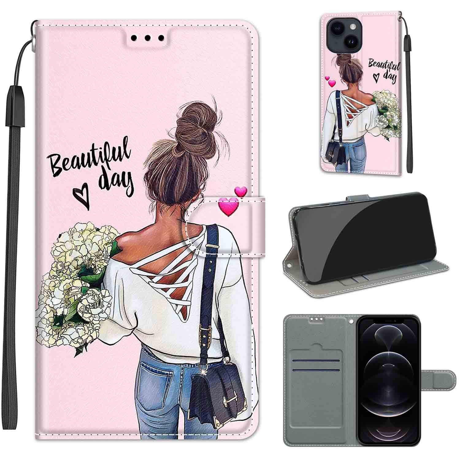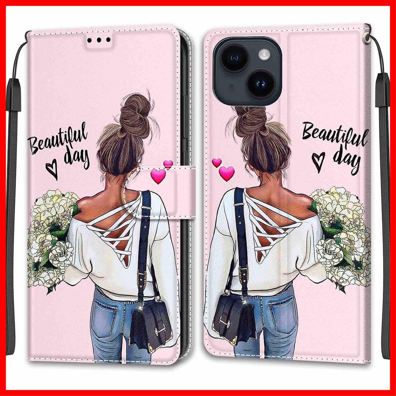 KENHONER iPhone 14 / 13 ケース手帳型 13 スマホケース 携帯カバー レザー 耐衝撃 耐摩擦 全面保護 マグネット式 カード収納 スタンド機能 手触りが良い 人気 上質 6.1インチ対応 女の子と花 | hananoki