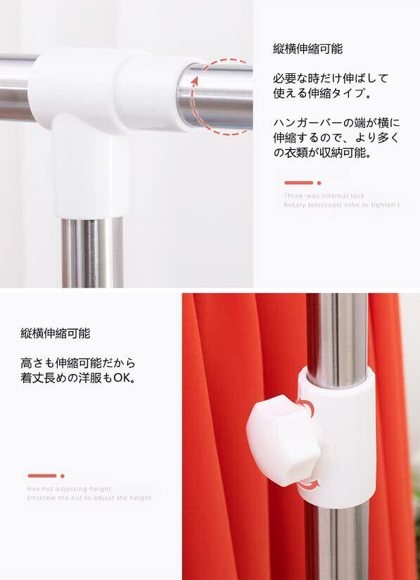 縦横伸縮可能:必要な時だけ伸ばして使える伸縮タイプ。 ハンガーバーの端が横に伸縮するので、より多くの衣類が収納可能。 高さも伸縮可能だから着丈長めの洋服もOK。