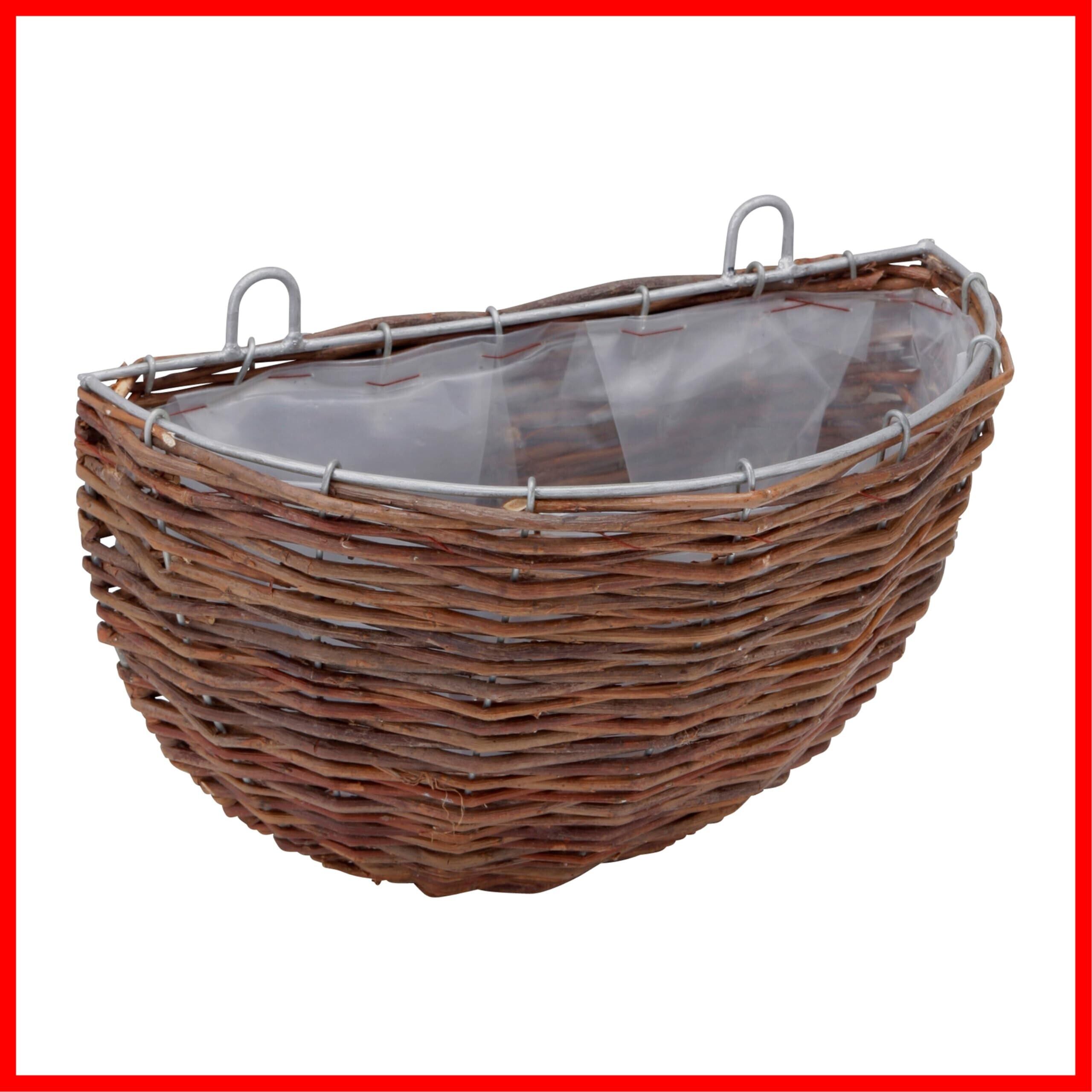 ラタンを編み込んだバスケット。寄せ植えに便利な壁掛けタイプです。スチールの内枠付き。内側はビニールシート張りで、乾燥しにくく、汚れにくい仕様。底部分には水抜き穴があります。