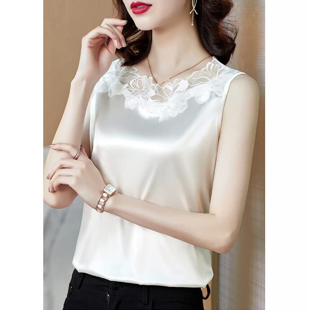[Phorecys] タンクトップ レディース サテン 光沢感 ノースリーブ ブラウス インナー キャミソール ストレッチ レース おしゃれ