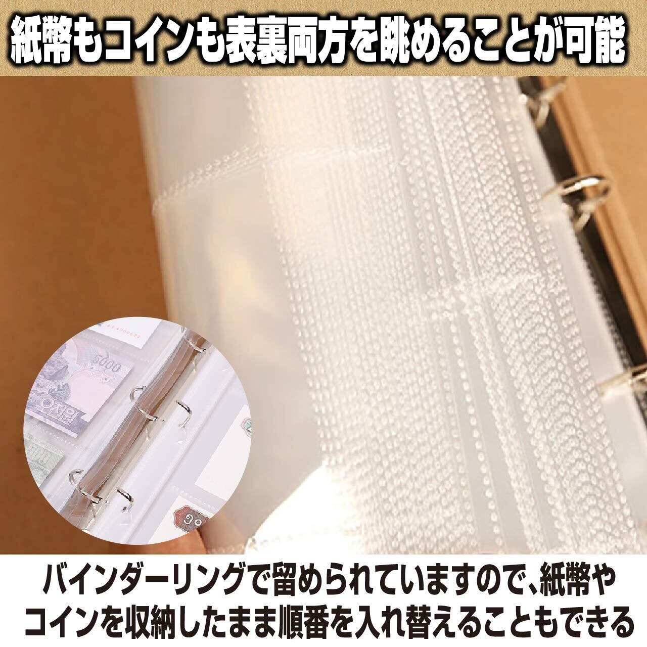 紙幣もコインも表裏両方を眺めることが可能:こちらのコレクションホルダーには柔らかなプラスチック素材が使われています。両面が透明ですので紙幣や硬貨の表裏両方を眺めることが可能。また、バインダーリングで留められていますので、紙幣やコインを収納したまま順番を入れ替えることもできます。