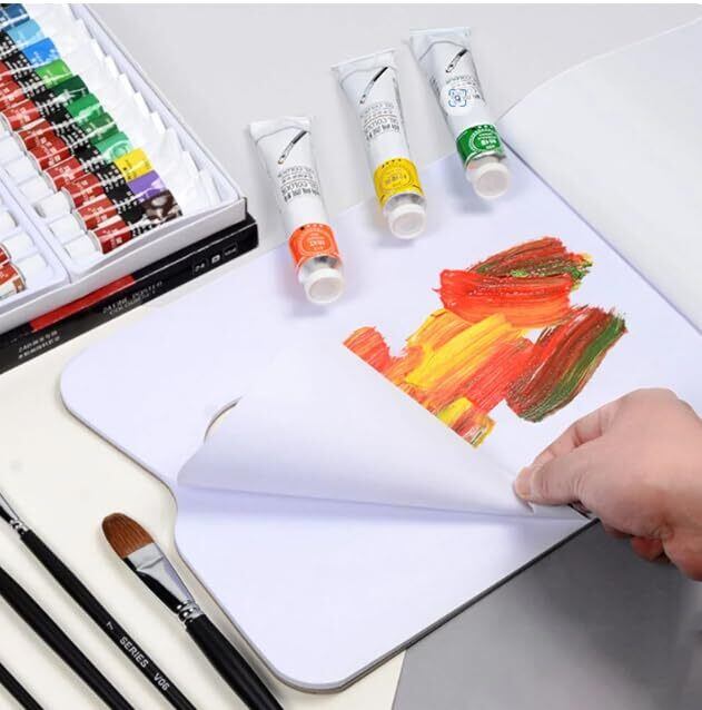 水を通さない紙を使用した、油彩やアクリルにもご利用頂ける使い捨てのパレットです。一枚使用したら切り離して捨て、また残りを使用していきます。