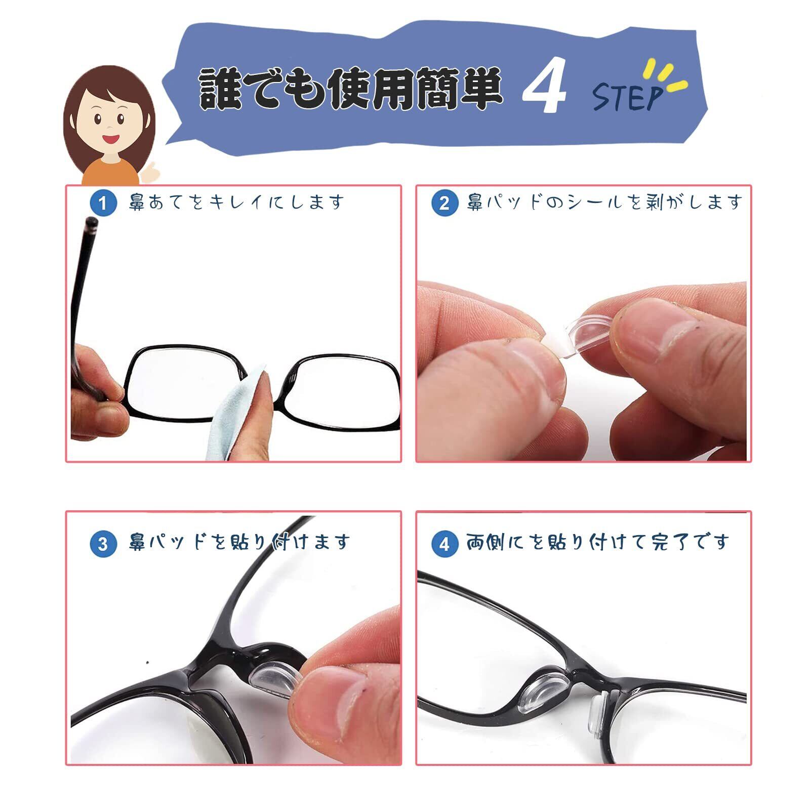 【簡単取付&対応幅が広い】 鼻パッドの使い方はクロスでメガネの鼻あて部分を拭き、鼻パッドのシールを剥してしっかりと押さえつけて眼鏡に貼り付けまるだけで完成です。メガネ用鼻パッドは様々な眼鏡に適用できます。 ●日常メガネ、PC用メガネやサングラス、フレーム眼鏡、サングラス、ノーズパッド、老眼鏡など、いろんなメガネに使用可能な眼鏡の鼻パットです。男女(メンズ・レディース)兼用、お年寄り、子供も使えます。眼鏡がよく滑って、鼻が低い人に適しています。