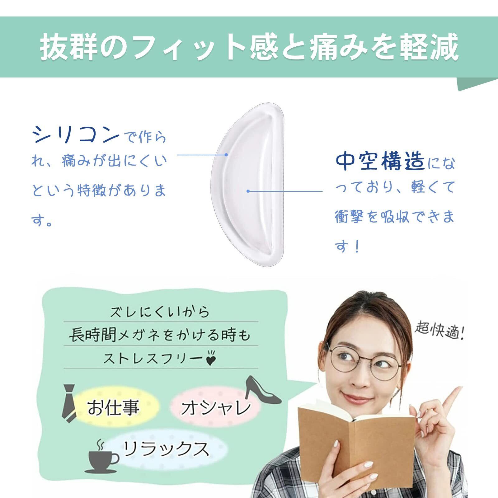 【人体に優しいシリコン素材&鼻への負担軽減】 人体に害がないと言われるシリコン素材を採用しておりますので、安心してご使用いただけます。シリコンタイプはプラスチックに比べて、鼻あての痕が残りにくく、痛みが出にくいという特徴があります。 ●この鼻パッドは中空構造になっており、軽くて衝撃を吸収でき、及び鼻の体型に合わせたD形状のデザインを設計されておりますので、メガネの痕や化粧くずれを防ぎます。シリコン素材でできているので、長時間の装着でも痛くなく掛け心地が快適です。
