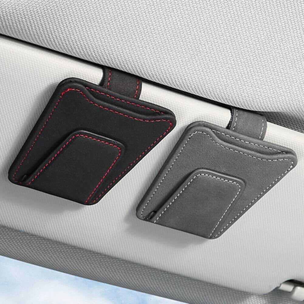 【取り付け簡単】背面のフックをサンバイザーに差し込んで使用するのでとても便利です。 革素材が金属クリップを包み込み、より安定しており、サンバイザーを傷つけません。