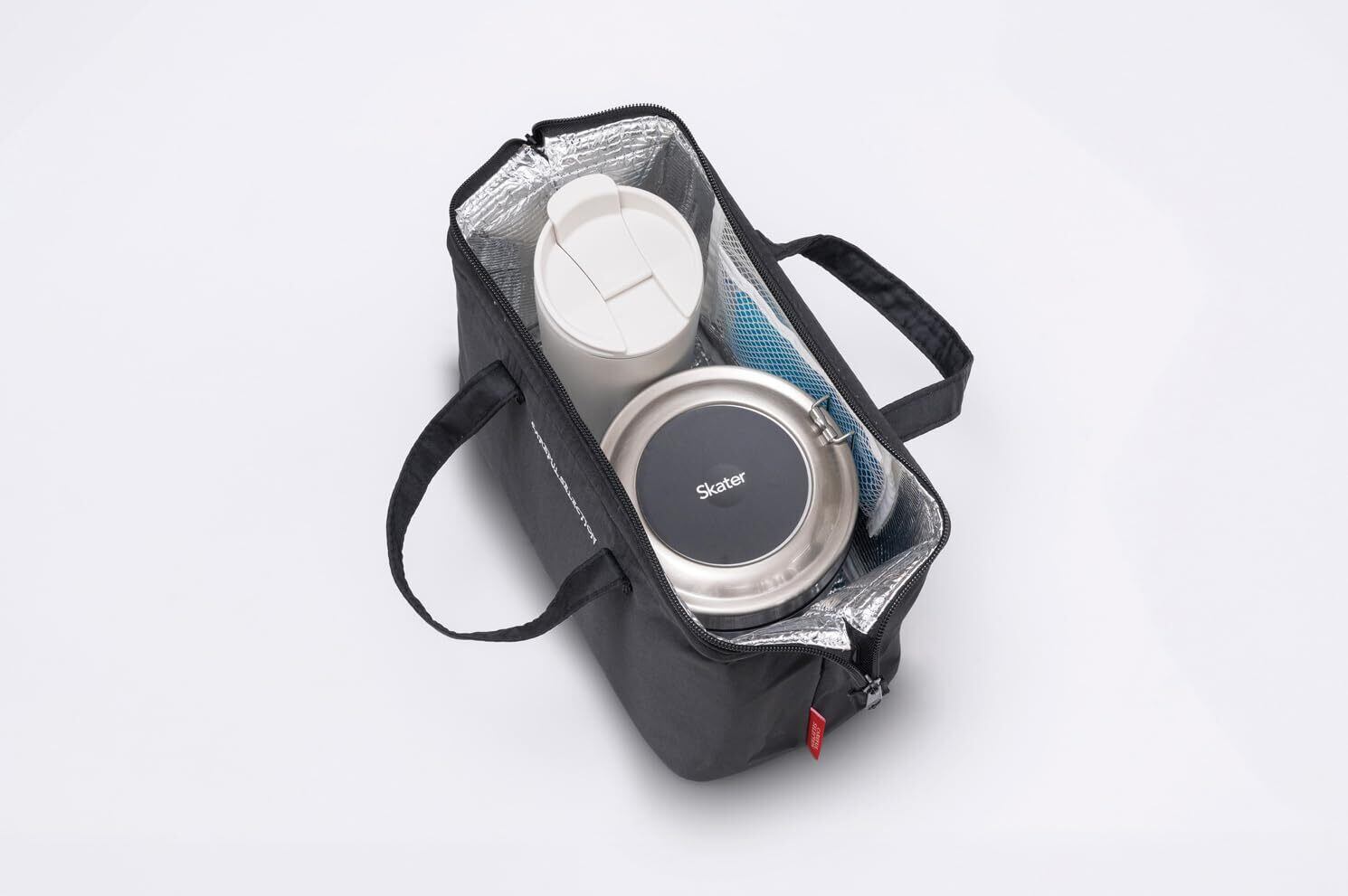 大きめのバッグなので2段のお弁当箱だけでなく小さな水筒も一緒に持ち運べます。また、内側はアルミ蒸着フィルムなので保冷をキープできます。保冷剤を入れるのにちょうどいいポケットも内側についています。ちょっとしたお出かけのサブバッグや普段使いとして小物などを入れてもOK!