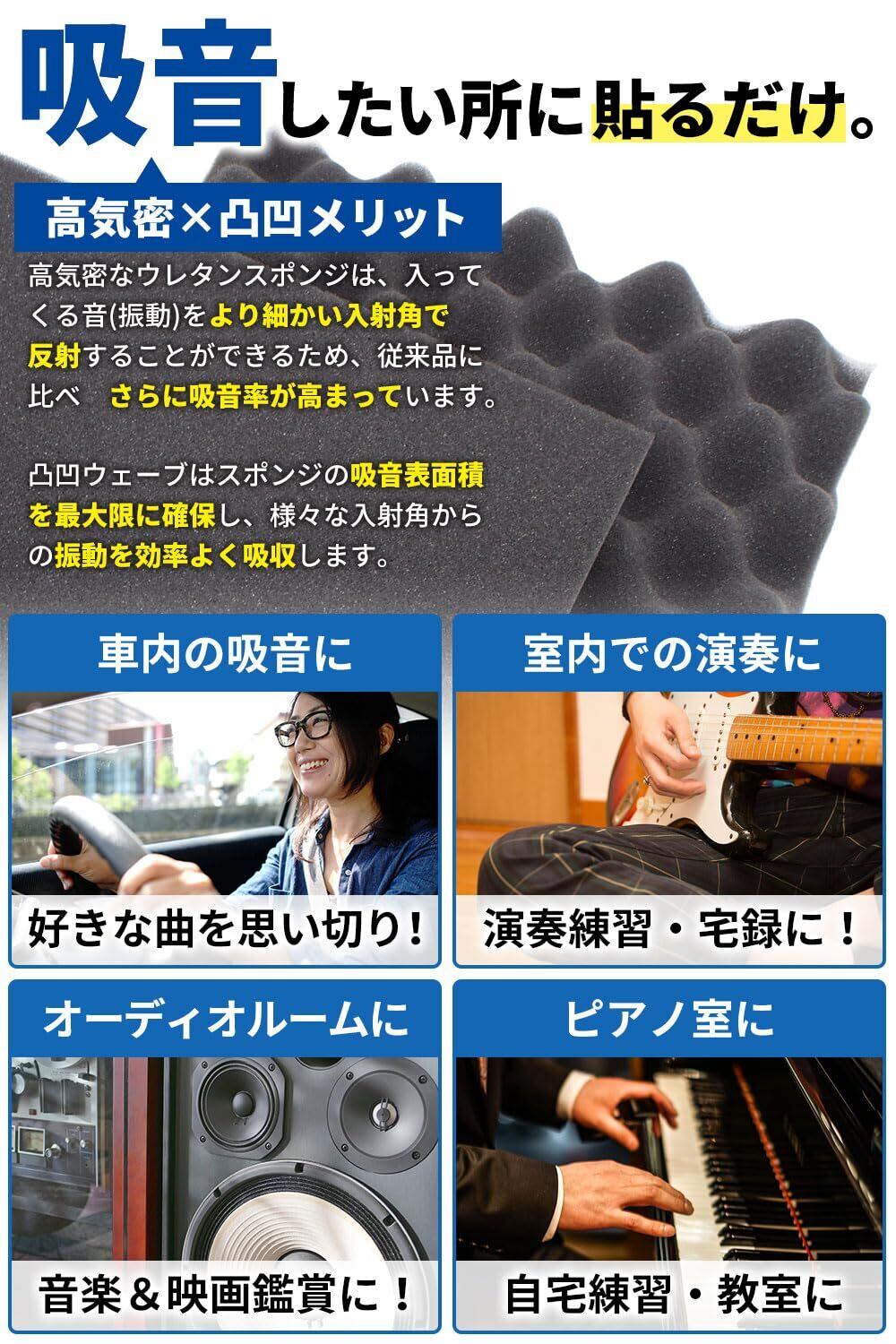 【 吸音 と 遮音 について 】吸音とは音の反射を吸収することです。吸音することで音の聞こえがクリアになります。材質は、スポンジなど軟らかく凸凹していると効果的でこちらの商品が最適です。遮音とは、音を遮断して伝わらなくすることで例えばピアノやステレオの音を外に出さない。外の音を中に入れないことです。材質は、遮音シート、石膏ボード、鉛など硬質で重量が必要となります。※こちらの商品で遮音はできません。
