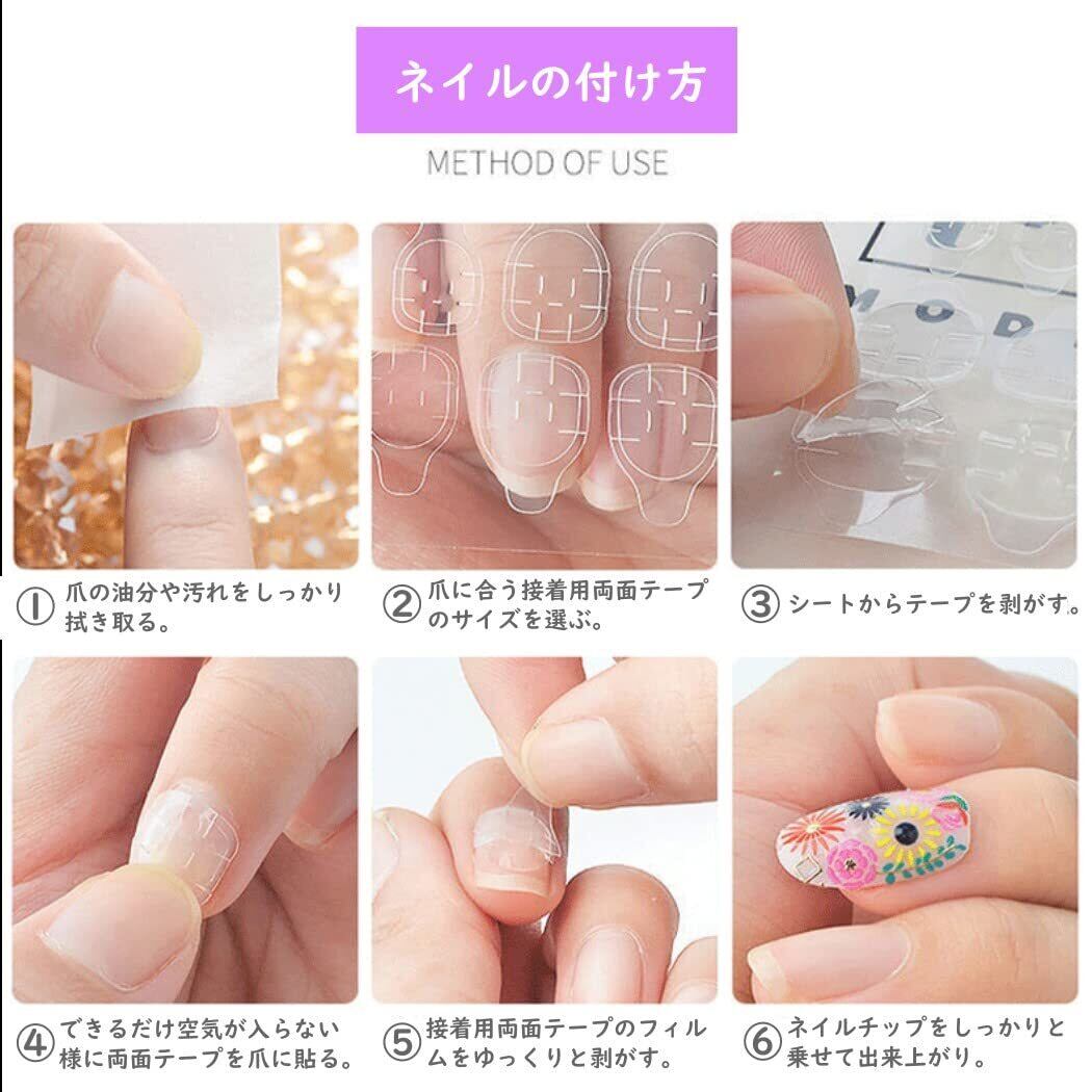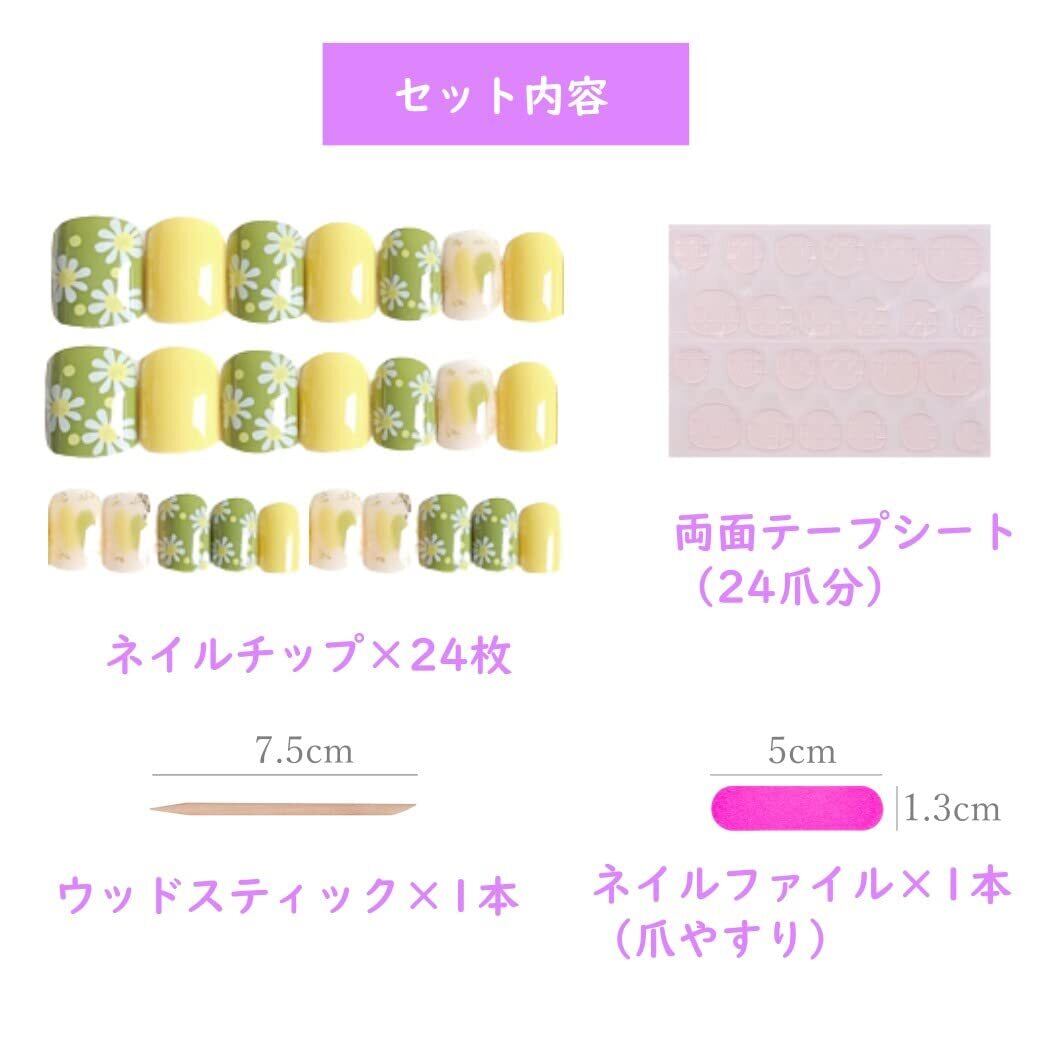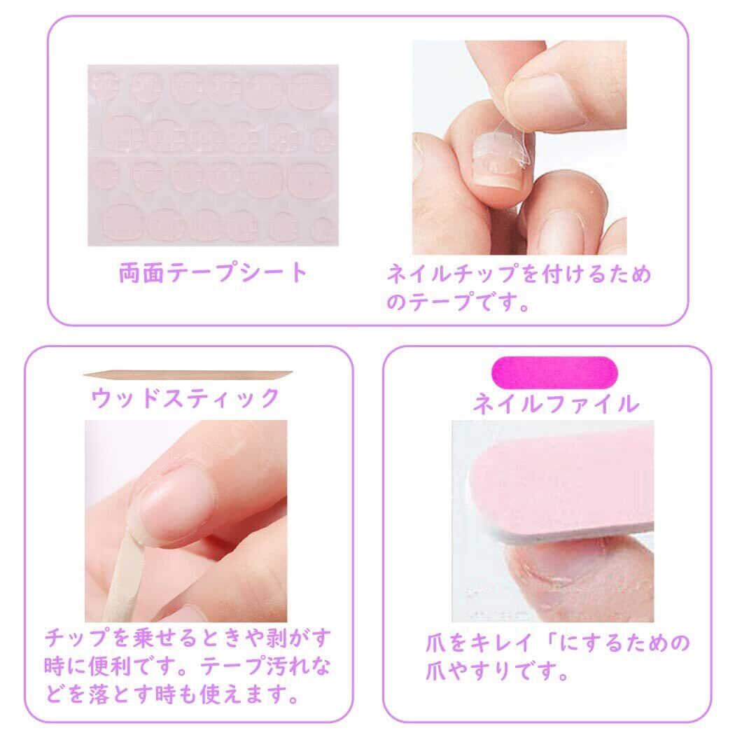 【セット内容】ネイルチップ24枚、両面テープ24枚、ネイルファイル(爪やすり)1個、ウッドスティック1本。