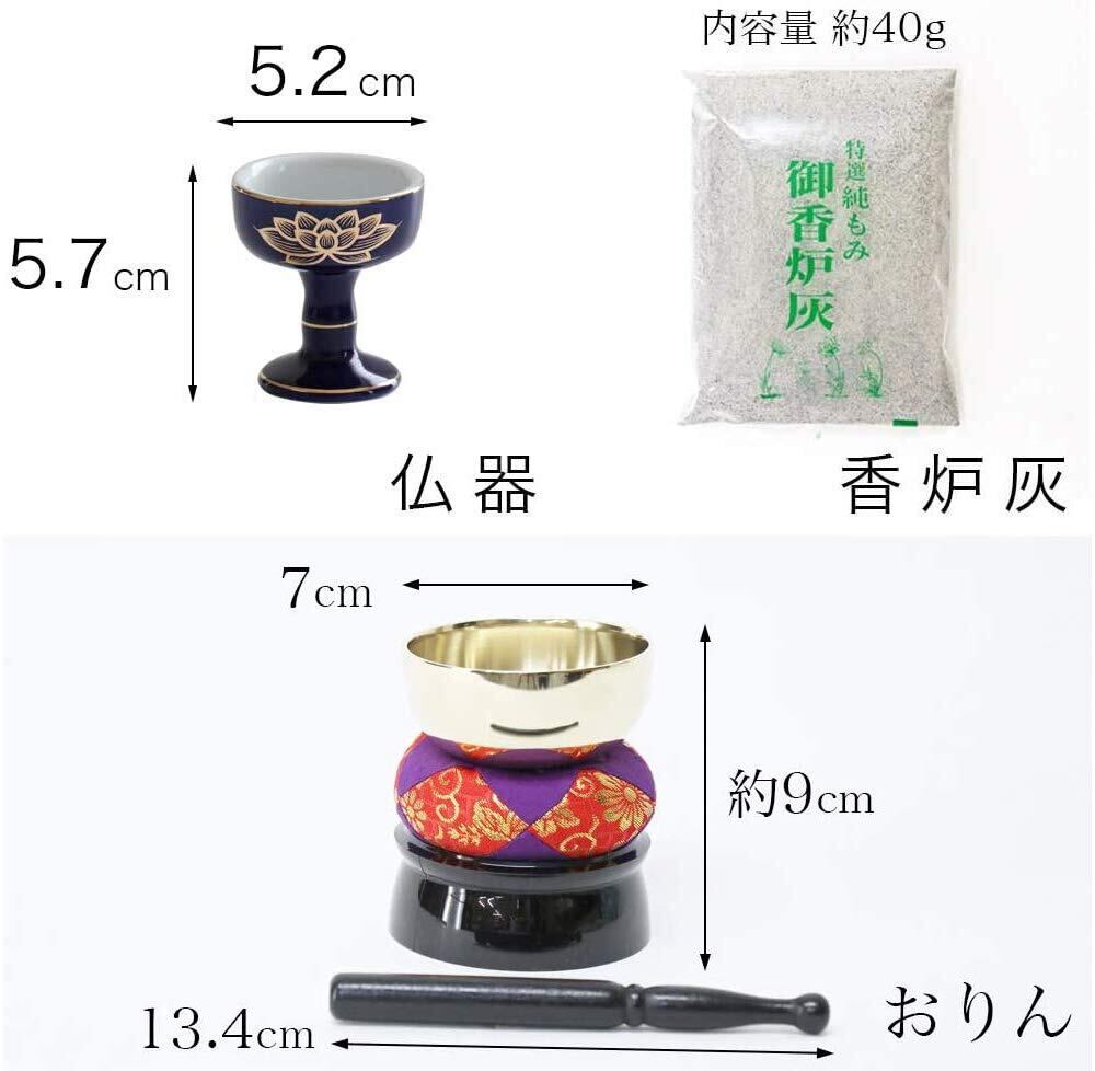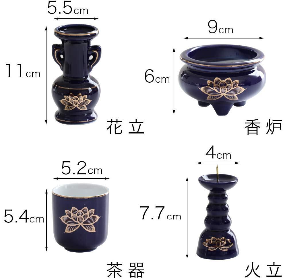 【サイズ】花立て:径5.5cm×高さ11cm、香炉:径9cm×高さ6cm、火立て:径4cm×高さ7.7cm、茶器:径5.2cm×高さ5.4cm、仏器:径5.2cm×高さ5.7cm おリンセット:幅約7cm×高さ約9cm