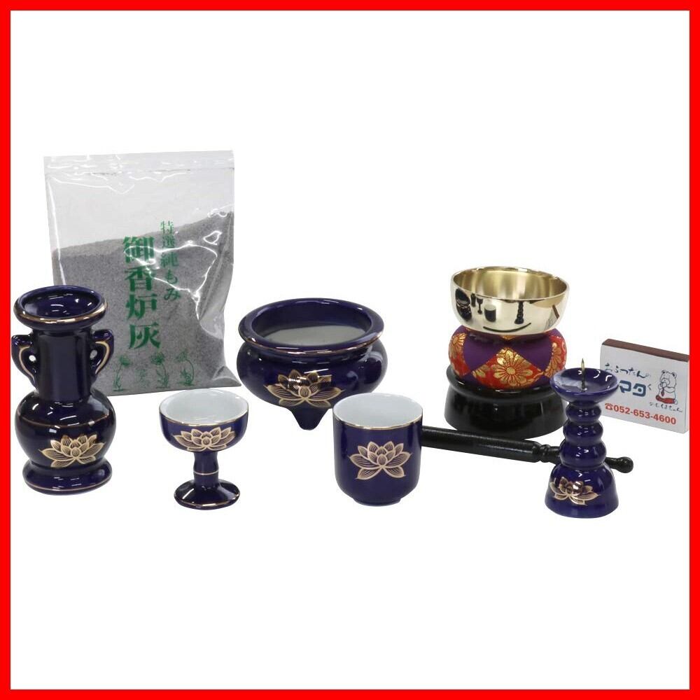 瑠璃色 金蓮 陶器5点(香炉・火立て・花立て・茶器・仏器)に国産おリン3点(おりん・りん棒・りん布団)を付けたお得なセットです。さらに香炉灰とマッチ付きです。