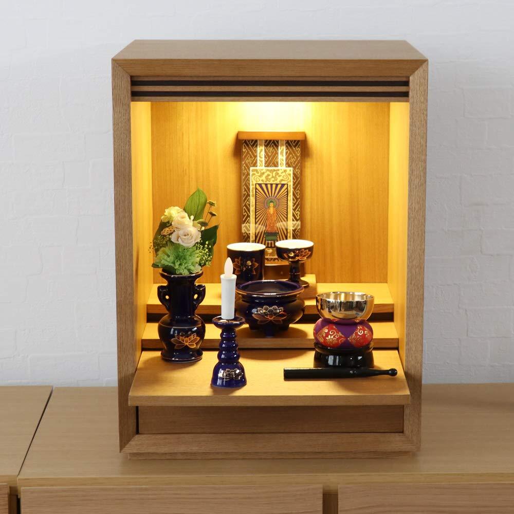 このセットは上置き仏壇やミニ仏壇に良く合います。陶器は岐阜県産で、金色の蓮の模様が締まります。