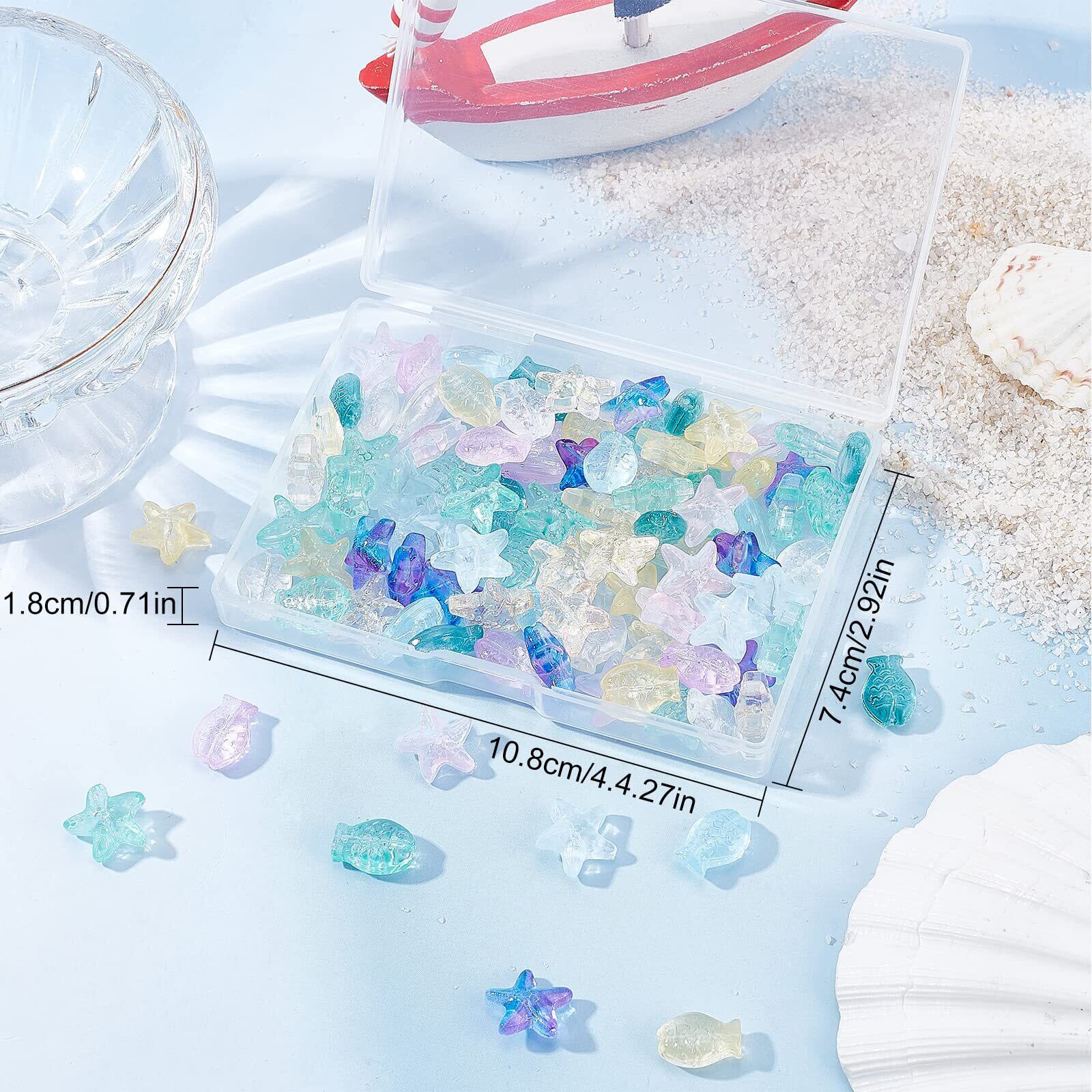 【サイズと数量】:魚ビーズ*60個6種:各10色と海星ビーズ*60個6種:各10色、合計120個です。魚ビーズのサイズ:14*10*5.5mmで、穴:1mmです。海星ビーズのサイズ:15*14*6.5mmで、穴:1mmです。収納ケース*1つ。