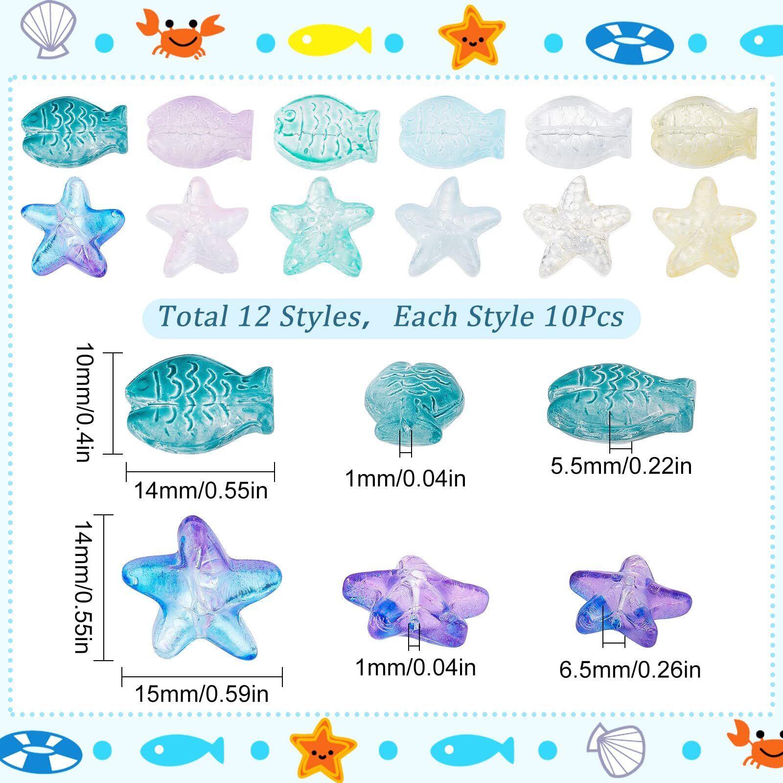 【120個10種魚ビーズ】:魚ビーズは魚和海星の模様を選び、全部で12種類異なるマカロン色があります。しかも毎種魚ビーズと海星ビーズは半透明で、とても夢幻的で、非常に特別なデザインです。魚ビーズは非常に精巧に作られており、魚の目、鱗、魚の尾を本物の魚を見たように生き生きとしたものにしています。