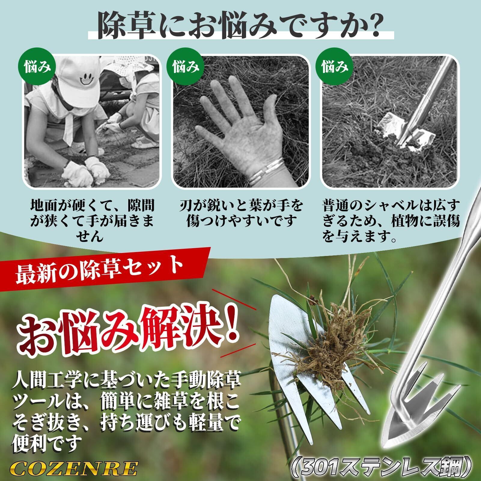 COZENRE 雑草抜き 草取り道具 雑草ブラシ 除草ツール 手動除草ツール 草取り器 ガーデニング用品 除草用具 雑草を根ごと抜く 庭園、庭、農場の雑草除去のためのデュアルパーパス手動除草ツール グローブ付き ステンレス製