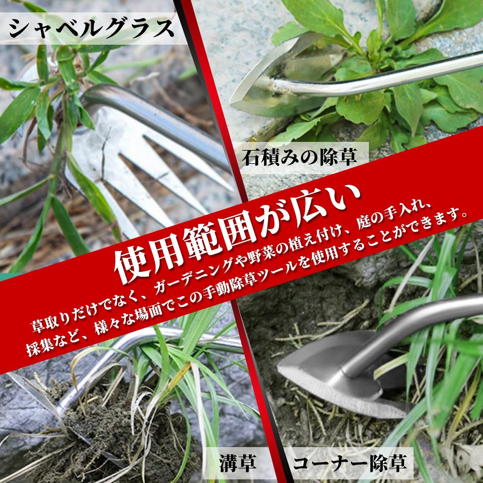 雑草抜き:当社の草取り道具、除草、掘削、シャベル作業などの農作業に最適な助手です。尖った先端は狭いスペースでも簡単に扱えますので、手作業で雑草を抜く手間を省くことができます!本体はステンレス素材を全面採用。防水仕様で、さらに頑丈で長持ちします。付属の滑り止めグローブで、草取りがさらに快適! 作業効率が劇的にアップします。